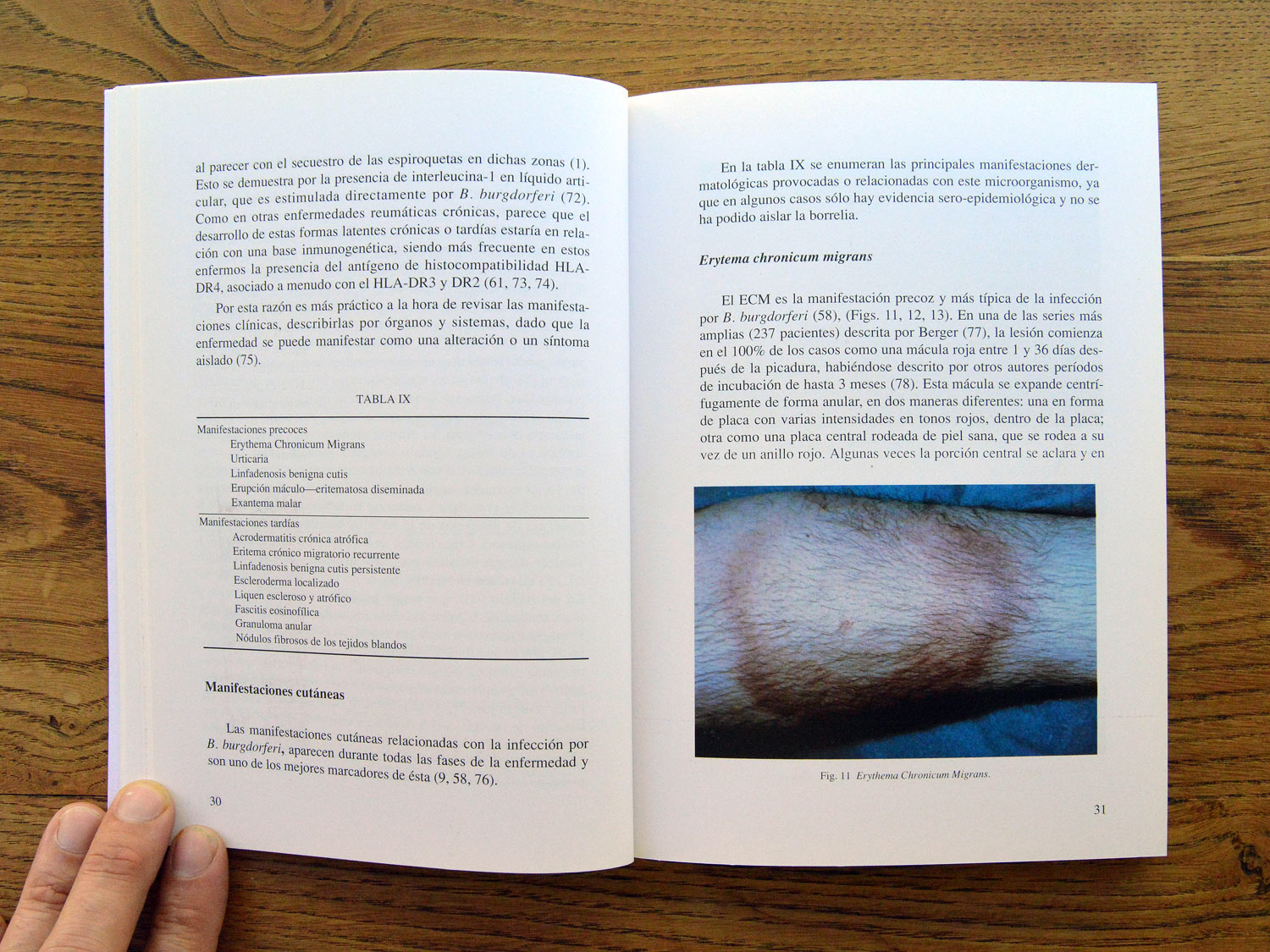 [3] Oteo Revuelta, José Antonio. 1994. Borreliosis de Lyme. Junta de Castilla y León, Consejería de Sanidad y Bienestar Social. Valladolid. 94 p [21 x 15 cm, ISBN: 84-606-1727-0].
