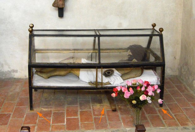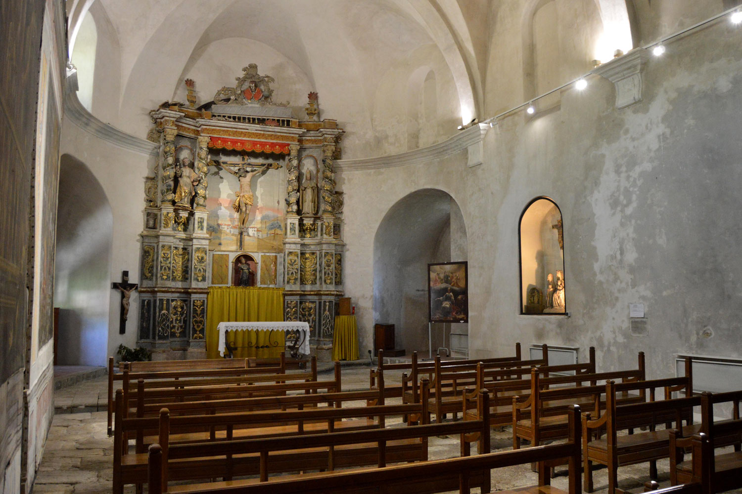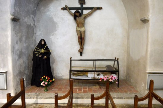 No soy de visitar iglesias. Así que mi visita iba a ser fugaz. Sin embargo, me fijé que los bancos estaban todos atacados por carcoma anóbida (Anobiidae). Aunque atacados es decir poco. Estaban muy atacados. Me pareció muy interesante averiguar qué carcomas había en esa iglesia. Luego vi que los retablos estaban también atacados. Cosa lógica al llevar centurias allí colocados. Estuve buscando por la nave algún ejemplar adulto. Siempre con sumo cuidado, porque ir con el aspirador entomológico por las esquinas de una iglesia no pinta muy bien. Pero, a pesar de ver bastante serrín caído de las galerías, no encontré ejemplares. Entonces, no sé por qué, me metí por una puerta y descubrí una capilla con su altar y diversos grupos escultóricos (figura 2). Y allí sí que encontré.