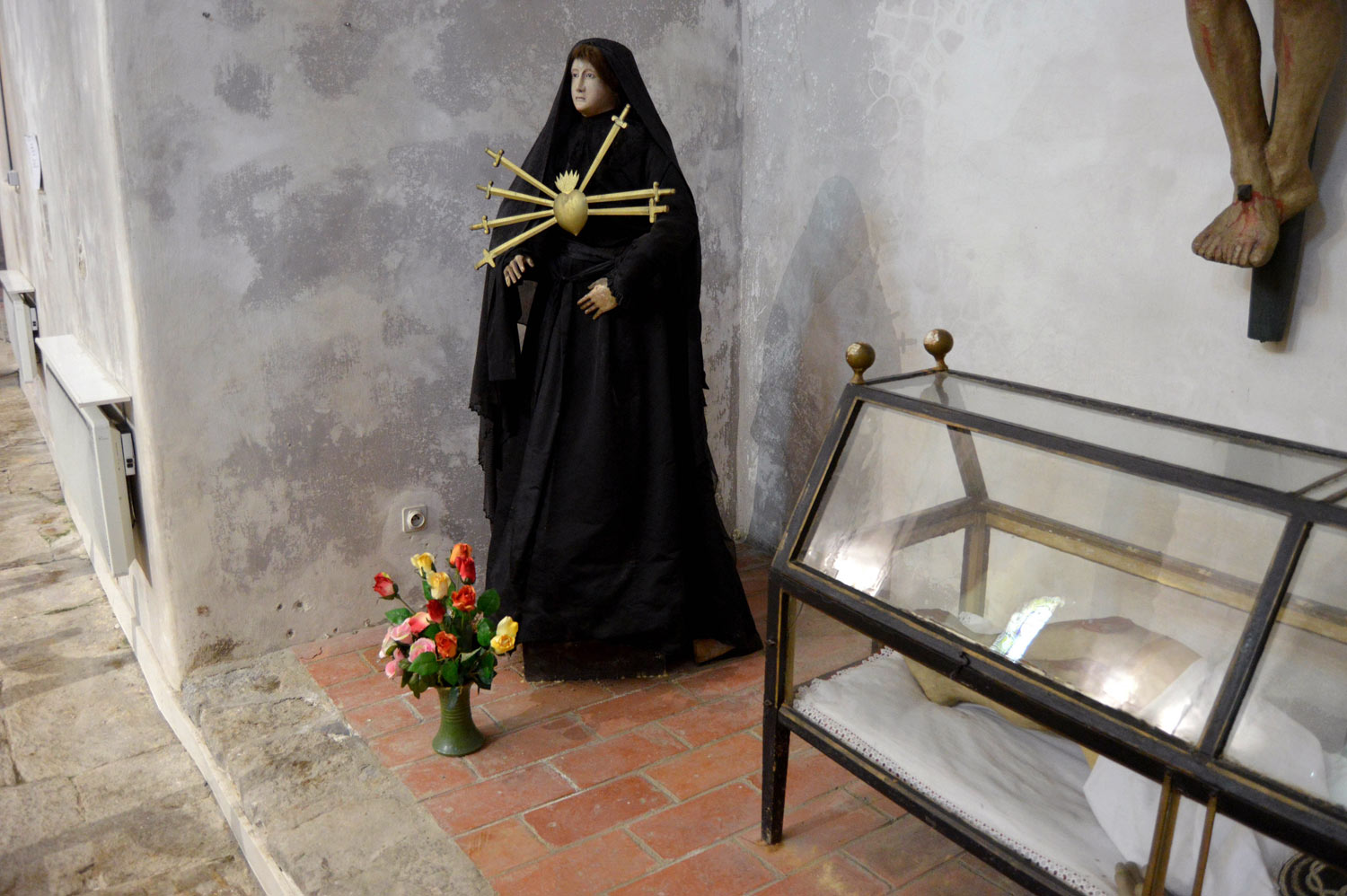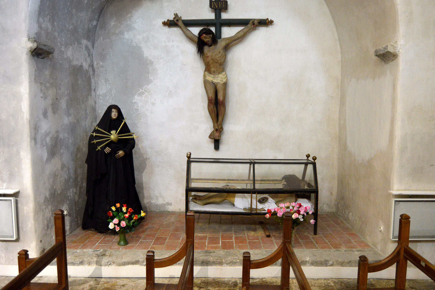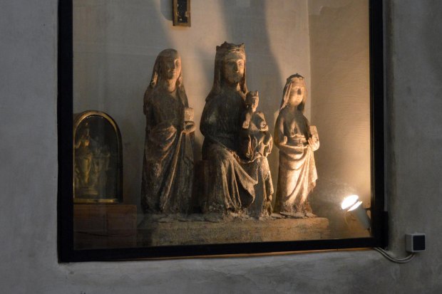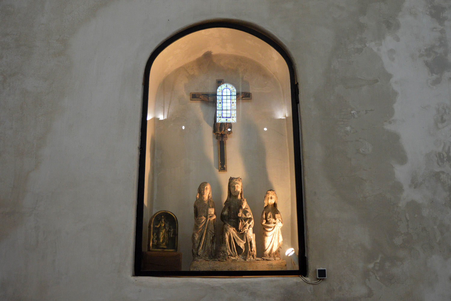 Encontré ejemplares de dos especies de anóbido: Anobium punctatum y Oligomerus ptilinoides. En principio, esto es lo común en una población del oeste del Mediterráneo y que perteneció al Principado de Cataluña hasta el Tratado de los Pirineos en 1659. Cada una de estas especies estaba en maderas diferentes. En la pared lateral derecha de la capilla había un espacio con un grupo escultórico de dudoso valor artístico (figura 3) y también una hornacina con una escultura que sí tenía valor por su antigüedad (figura 7). Veamos.