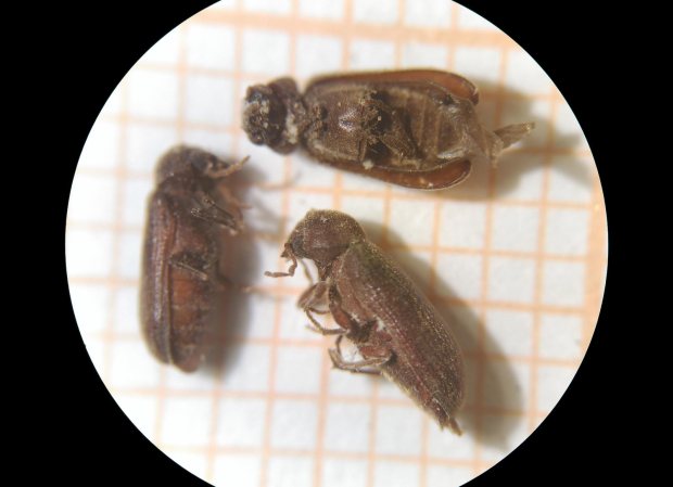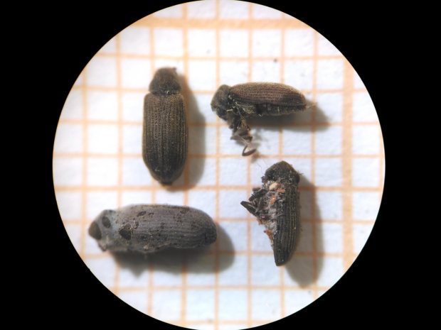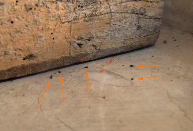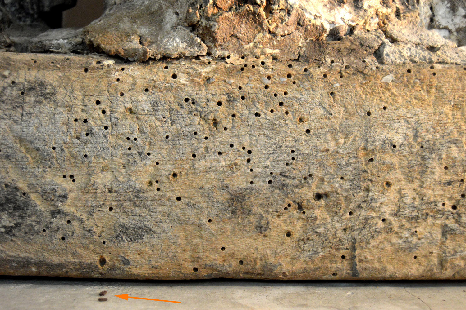 La especie Anobium punctatum estaba atacando la estructura de madera que aguantaba a una santa (figura 4) y a la urna con el Cristo (figura 5). Se podía ver serrín en el suelo. Recogí una decena de ejemplares en mal estado de conservación de los que se pueden ver cuatro en la imagen número 6. Por otra parte, la especie Oligomerus ptilinoides estaba atacando una escultura románica del siglo XIII que presidía la hornacina. Entiendo que esta escultura de madera policromada y dorada es originaria de cuando se levantó el tempo románico. Se pueden ver varias imágenes de la actividad de la carcoma. Y en la imagen número 13, hay tres ejemplares que pude recolectar.