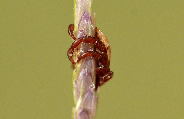 En las imágenes se puede ver la posición que adoptan de espera. Con dos o tres pares de patas se sujetan firmemente a la hierba. Y mantienen el primer par de patas extendido a modo de antenas, ya que en su extremo tienen unas sedas sensibles que les ayudan a detectar al hospedador. Las garrapatas reconocen al hospedador por las vibraciones, los cambios de temperatura y los olores. Cuando se acerca un posible hospedador, extienden aún más las extremidades en la dirección por la que viene. Y si este roza la hierba, rápidamente se agarran.