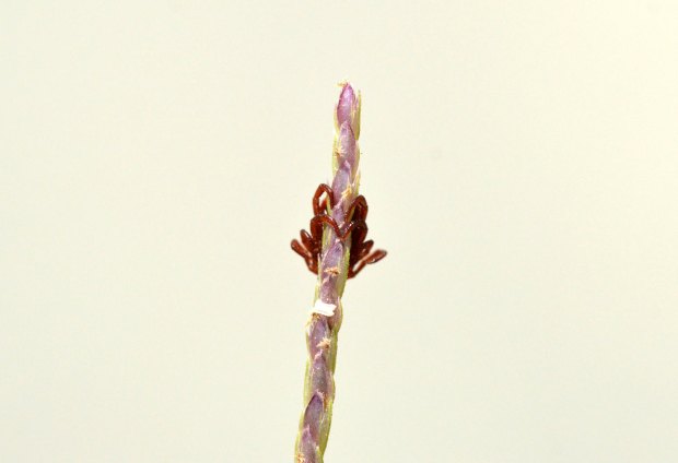 Fig 1. Una calle con dos garrapatas Rhipicephalus sanguineus colgadas de una ramita de hierba./ C. Pradera 07-2018