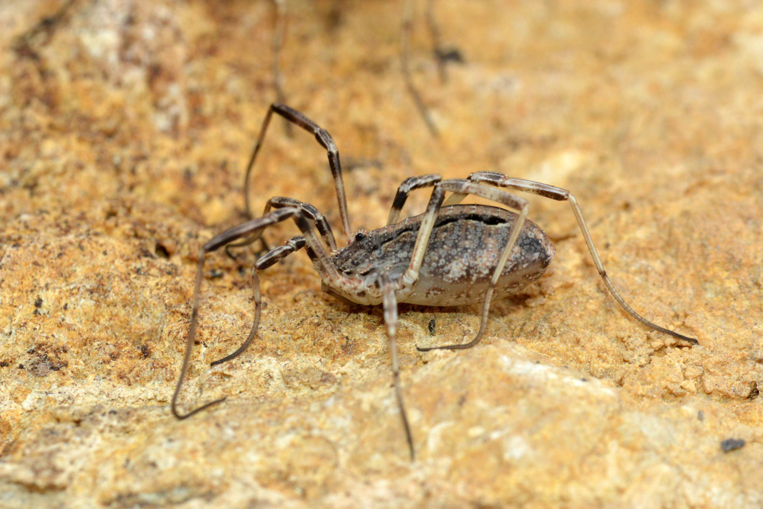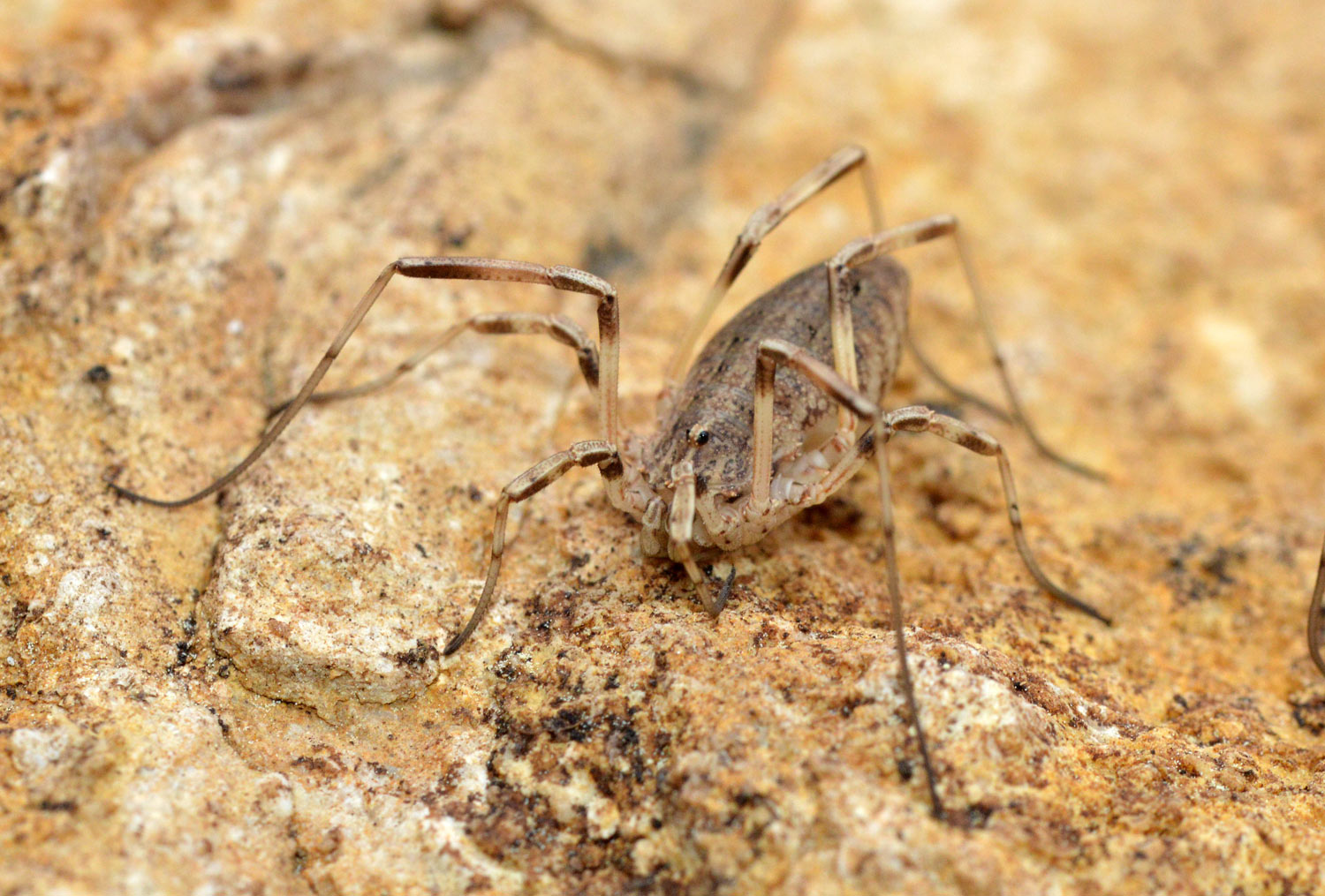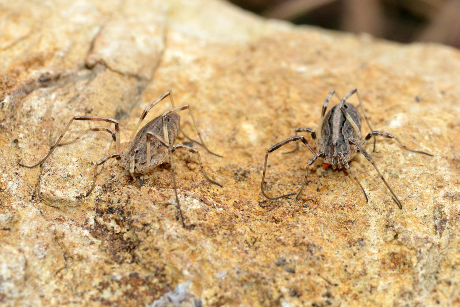Hace una semana estaba buscando hormigas en la Sierra del Montsec (Lleida). Estaba en una cima a 1.570 m de altitud donde se encuentra el observatorio astronómico. Buscaba, entre otros lugares, debajo de piedras. Y justo la última que levanté me dio una alegría. Había una pareja de opiliones preciosos. Volteé la piedra para observarlos. No se inmutaron. Se quedaron quietos todo el rato que estuve tomando fotografías. Luego volví a colocar la piedra con cuidado en su sitio. Tuve la suerte de encontrar un macho y una hembra de Odiellus troguloides.