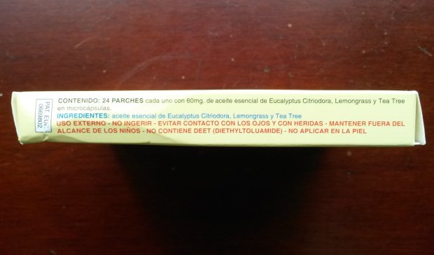 Hace 15 días vi en casa de un cliente una caja de parches repelentes de la marca Cer’8 Tigre que comercializa Mauris Exclusivas SA de Barcelona (figuras 10 a 13). Se publicita bajo la frase «proteja a su familia» tocando la fibra sensible. Son 24 parches «100% natural y ecológico» de «venta en farmacias». El contenido de cada parche es de «60 mg. de aceite esencial de Eucalyptus Citriodora, Lemongrass y Tea Tree en microcápsulas». Al ver este producto me planteé hacer una prueba de campo. Me he dado cuenta de que se trata de un producto en auge. Y bien vale la pena dejar testimonio para informar a otras personas.