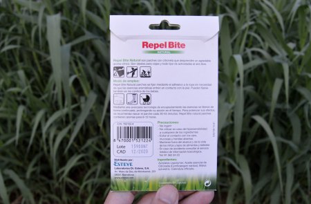 La descripción del producto es que Repel Bite Natural «son parches con citronela que desprenden un agradable aroma cítrico. Son ideales para viajes y todo tipo de actividades al aire libre.» Nada más. Sobre su modo de empleo se explica que los parches «se fijan mediante el adhesivo a la ropa sin necesidad de que las esencias aromáticas entren en contacto con la piel. Pueden fijarse también en los carritos de los bebés.» Se trata de un producto natural que no es inocuo, ya que la etiqueta dice que ha de evitarse el contacto con la piel. Y además, se puede fijar al carrito de un bebé, lo cual es una frase buscada para jugar con los padres protectores. Es decir, para tocar la fibra sensible. También se puede leer: «Mediante una avanzada tecnología de encapsulamiento las esencias se liberan de forma continuada. prolongando su acción en el tiempo. Para potenciar sus efectos, se recomienda rascar el parche cada 30-45 minutos. Repel Bite Natural parches contienen aromas para 8-12 horas». Ya está. No hay más texto descriptivo de su uso en la etiqueta. En ningún lugar se dice para qué sirve, ni contra qué artrópodos protege. Y tan solo se dice que puede oler hasta 12 horas. Pero oler no significa que repela. Ni que funcione. De lo que pone en la etiqueta parece que se trate de un producto aromático.