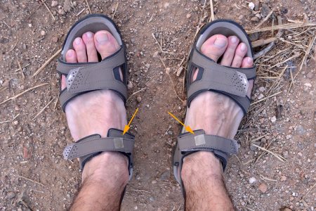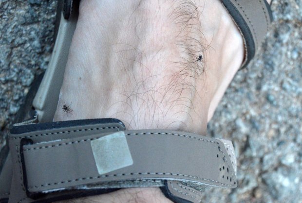 Con los parches en mano, decidí realizar dos experiencias en dos días y zonas diferentes. Para ello busqué cerca de mi casa dos lugares donde las hembras del mosquito tigre (Aedes albopictus) reposan durante el día en gran número. Busqué dos zonas con una cubierta vegetal lo suficientemente densa como para que la humedad bajo las hojas fuera la adecuada para los mosquitos. En ambos casos, busqué una hiedra (Hedera) que creciera sobre un muro que delimitara una propiedad. Para resultar más atractivo a las hembras, me puse unas sandalias y así dejar descubierto el pie. Luego decidí poner un parche sobre cada sandalia (figura 6). De esta manera, la protección sería mayor al llevar dos parches. Es decir, más olor en el ambiente. Las imágenes 6 a 9 pertenecen a la primera experimentación. Y la imagen 1 pertenecer a la segunda que realicé unos días después. Como se puede observar, las hembras de Ae. albopictus no se sintieron en ningún momento repelidas por la presencia del parche oloroso.