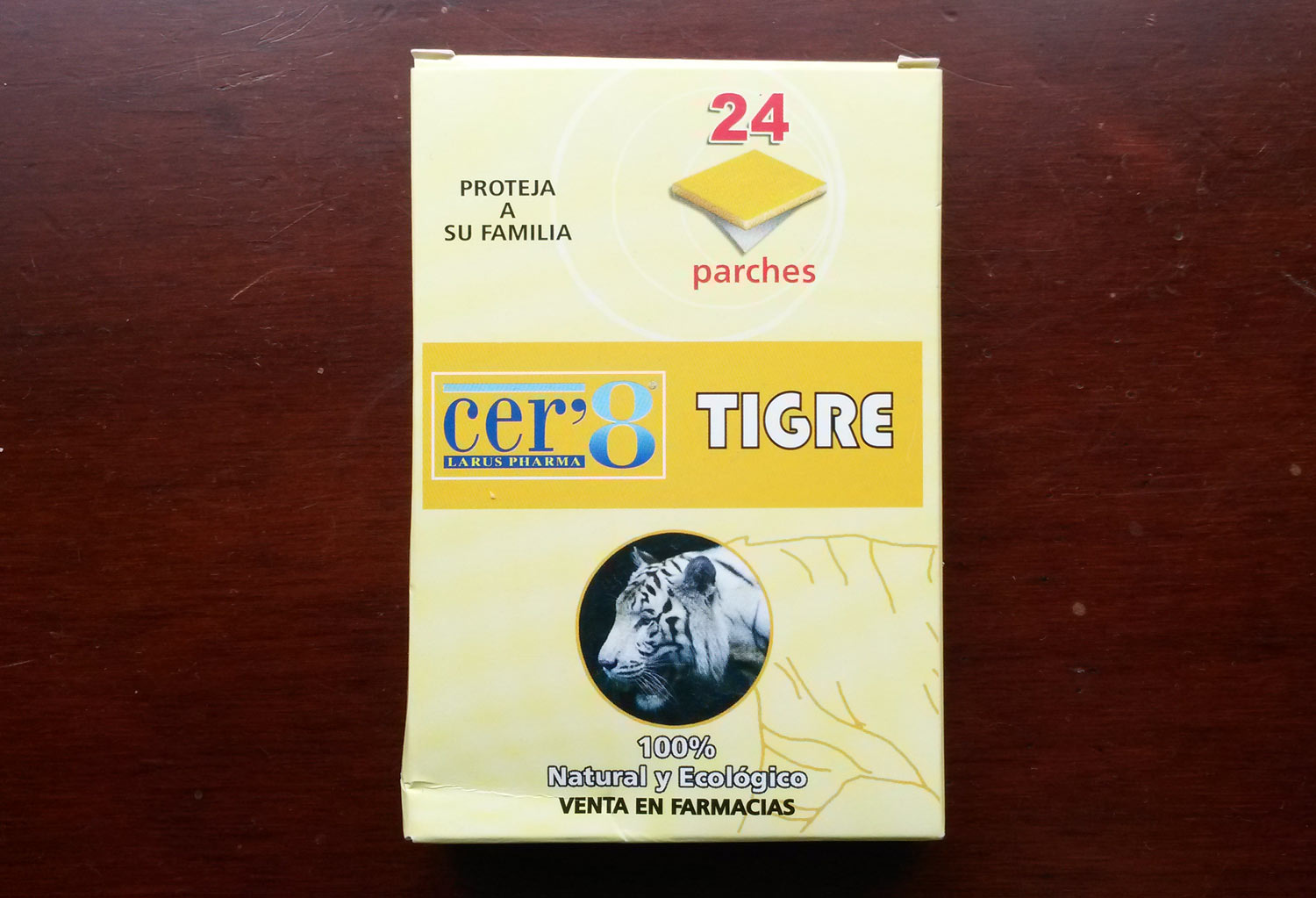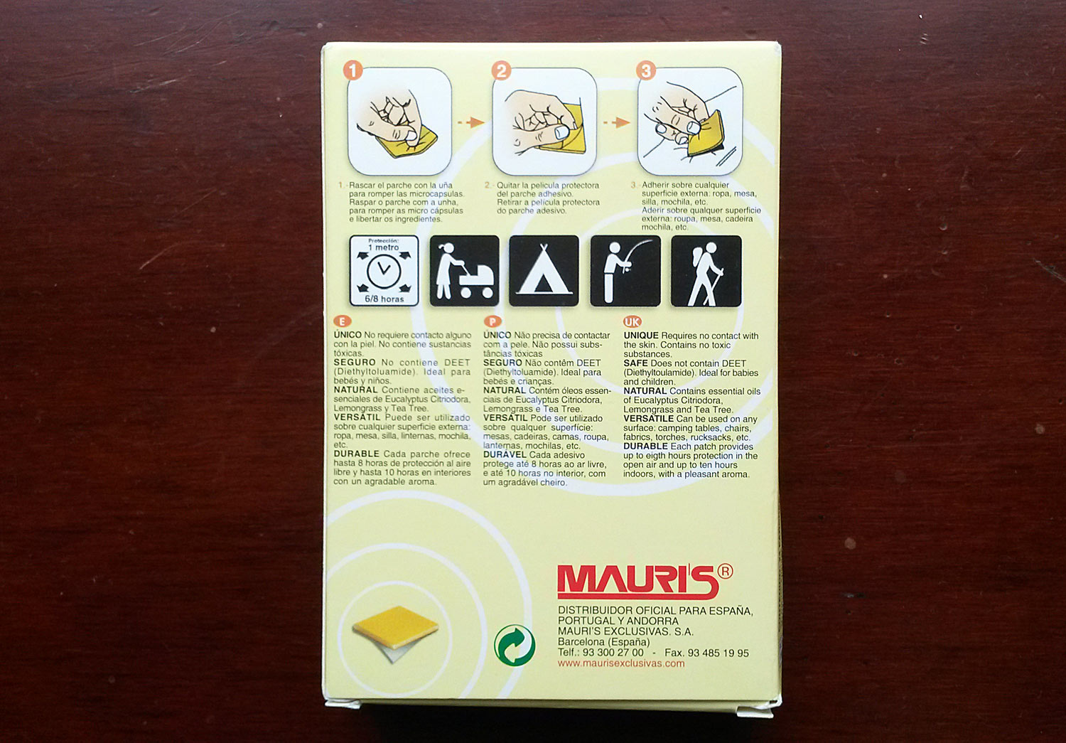 Hace 15 días vi en casa de un cliente una caja de parches repelentes de la marca Cer’8 Tigre que comercializa Mauris Exclusivas SA de Barcelona (figuras 10 a 13). Se publicita bajo la frase «proteja a su familia» tocando la fibra sensible. Son 24 parches «100% natural y ecológico» de «venta en farmacias». El contenido de cada parche es de «60 mg. de aceite esencial de Eucalyptus Citriodora, Lemongrass y Tea Tree en microcápsulas». Al ver este producto me planteé hacer una prueba de campo. Me he dado cuenta de que se trata de un producto en auge. Y bien vale la pena dejar testimonio para informar a otras personas.