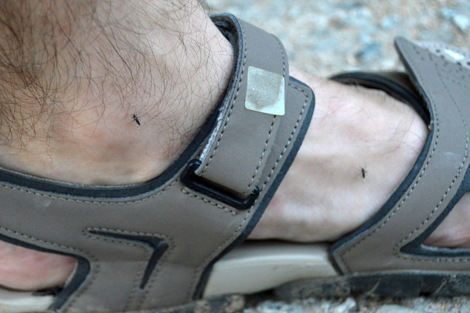 Con los parches en mano, decidí realizar dos experiencias en dos días y zonas diferentes. Para ello busqué cerca de mi casa dos lugares donde las hembras del mosquito tigre (Aedes albopictus) reposan durante el día en gran número. Busqué dos zonas con una cubierta vegetal lo suficientemente densa como para que la humedad bajo las hojas fuera la adecuada para los mosquitos. En ambos casos, busqué una hiedra (Hedera) que creciera sobre un muro que delimitara una propiedad. Para resultar más atractivo a las hembras, me puse unas sandalias y así dejar descubierto el pie. Luego decidí poner un parche sobre cada sandalia (figura 6). De esta manera, la protección sería mayor al llevar dos parches. Es decir, más olor en el ambiente. Las imágenes 6 a 9 pertenecen a la primera experimentación. Y la imagen 1 pertenecer a la segunda que realicé unos días después. Como se puede observar, las hembras de Ae. albopictus no se sintieron en ningún momento repelidas por la presencia del parche oloroso.