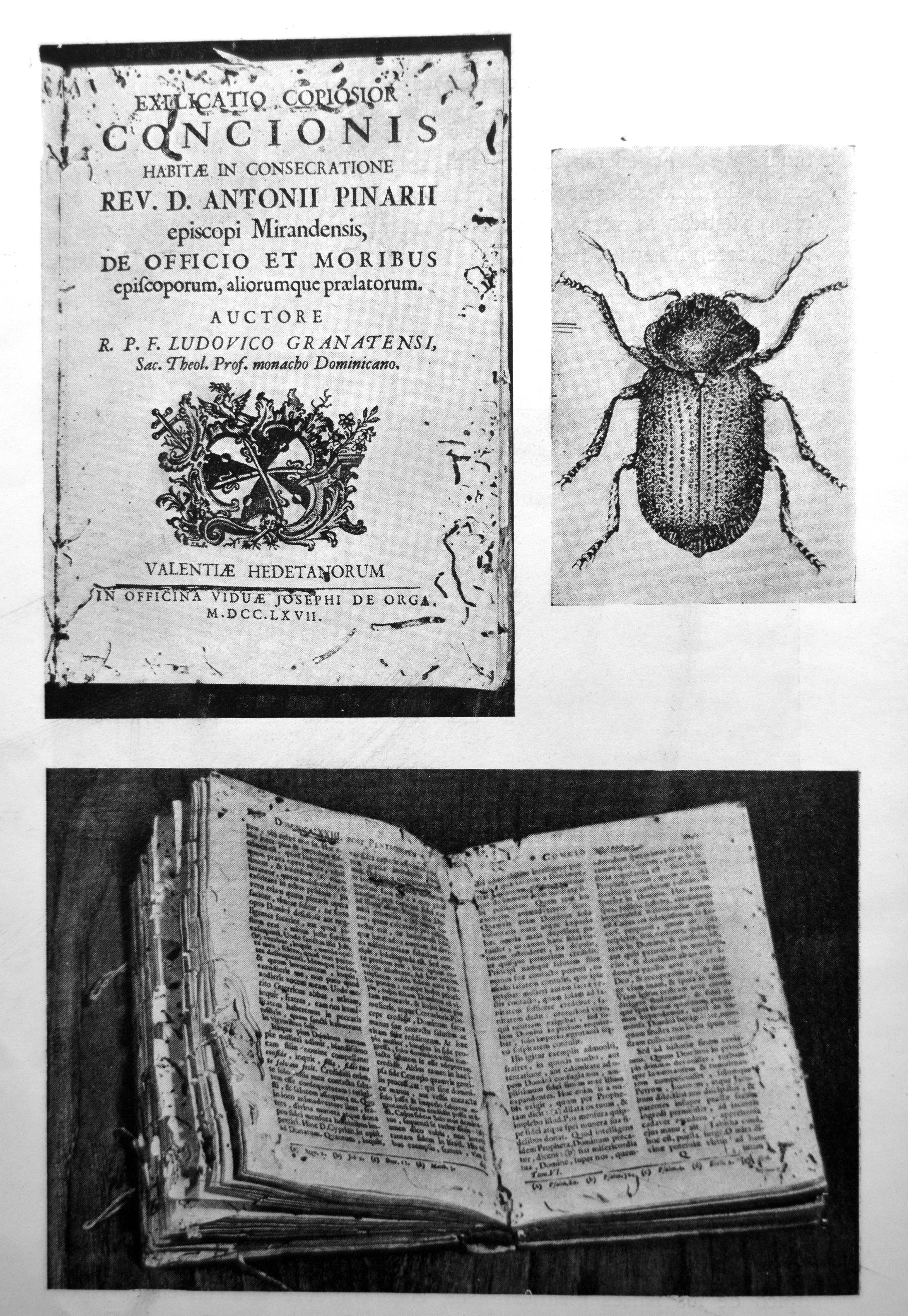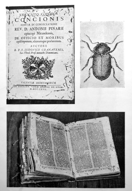 En segundo lugar, he encontrado información muy interesante en un libro de Joaquín Martín Diéguez, uno de los grandes especialistas en conservación de la madera de España. En su libro dedicado a los anóbidos dañinos en muebles y construcciones [2], dedica un pequeño apartado a Nicobium castaneum. Da como medidas de su longitud entre 4 a 5 mm, lo cual cuadra más con lo que he encontrado. Explica que es un anóbido típico de los países mediterráneos que se puede encontrar por toda la Península Ibérica, especialmente en Portugal. Da por bien descritas las variedades hirtum y subparallelum. Los ataques importantes son sobre libros antiguos produciendo importantes destrozos. En la imagen número 4, se pueden ver daños en libros que aparecen en la obra de este autor. En cuanto a los ataques sobre madera obrada, se consideran de poca importancia.