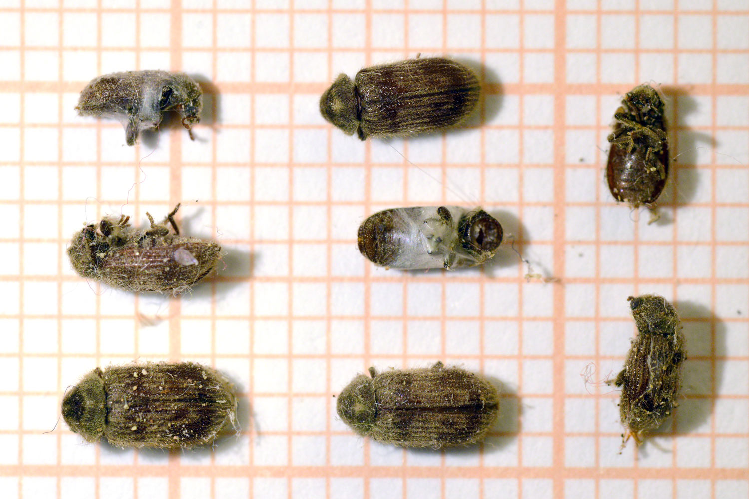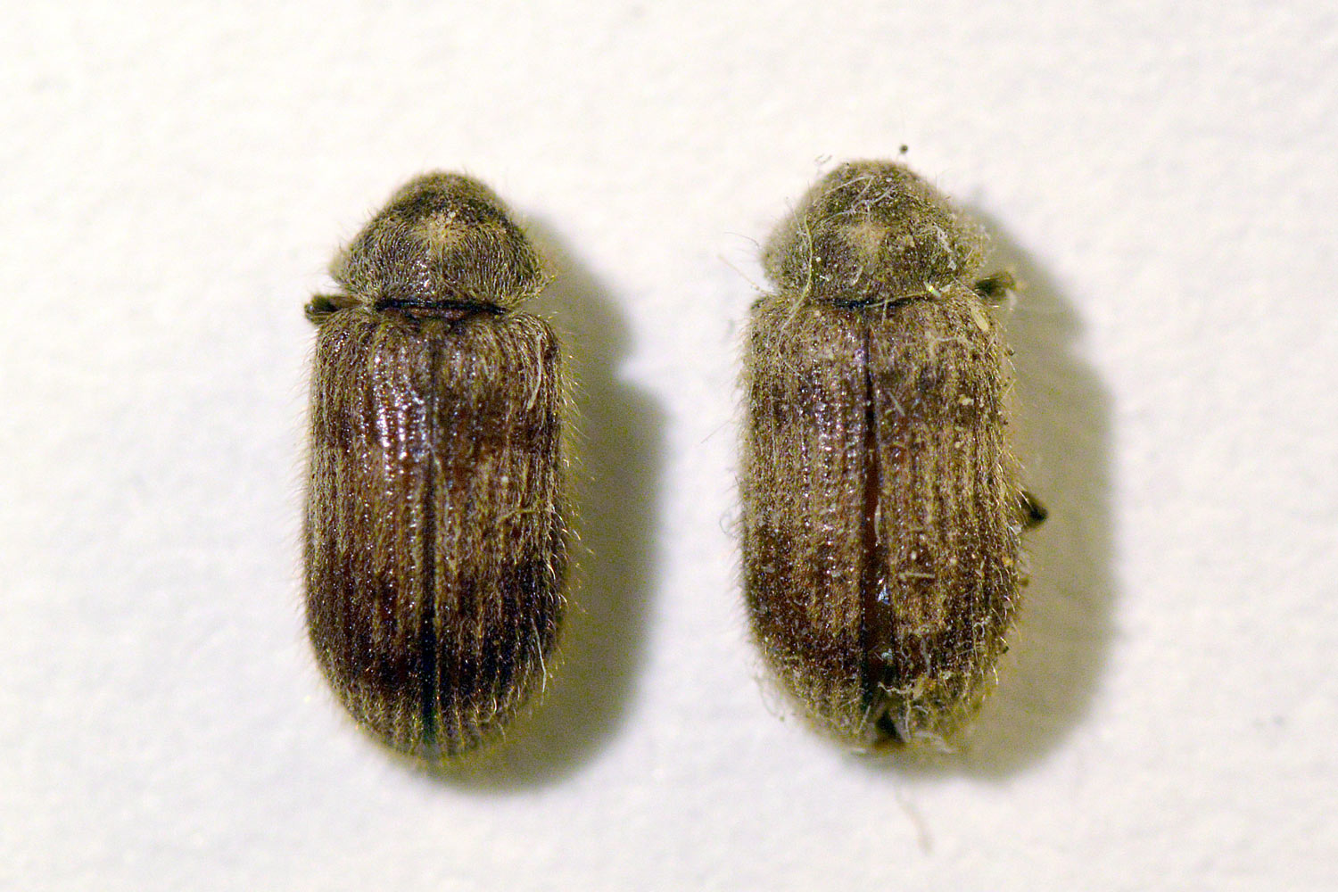 Vayamos a la biología y a los daños que produce sobre madera obrada. En este punto, hay que anotar que es un anóbido poco tratado en los manuales de protección de la madera. Por suerte, dispongo de dos fuentes en mi biblioteca. En primer lugar, la obra de F. Español Coll dedicada a los anóbidos. Este autor dedica una página y un dibujo a esta carcoma. Como medidas de longitud se dan de 5 a 6’5 mm. Estas medidas difieren de los ejemplares por mí recolectados que van de 3’5 a 5 mm aproximadamente (figura 3). Se explica que hay diferencias importantes entre las dos variedades de N. castaneum. Explica que mientras la variedad típica presenta «hábitos antropófilos y régimen bibliófago, la variedad hirtum conserva hábitos silvestres y el régimen xilófago primitivo». Parece ser que está constatada la esterilidad de los híbridos de ambas variedades por lo que deberían ser consideradas dos especies gemelas. La variedad hirtum atacaría «indistintamente la madera de frondosas y de resinosas, si bien sus daños parecen ser de escasa consideración». También se explica que esta especie completa el ciclo en un año pasando en el estadio de larva la mayor parte del tiempo durante el otoño, invierno y principios de primavera.