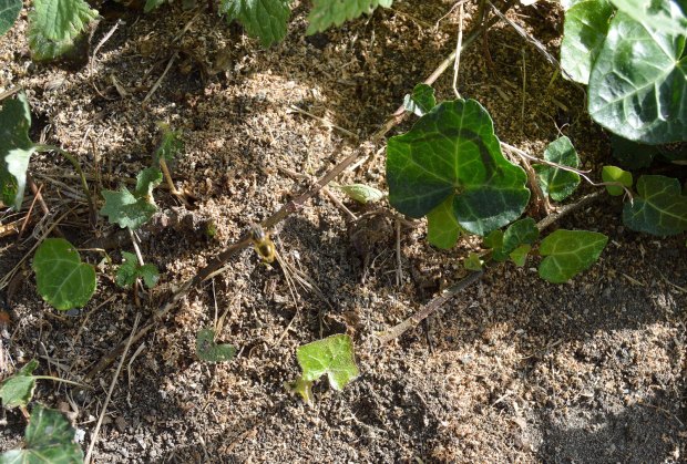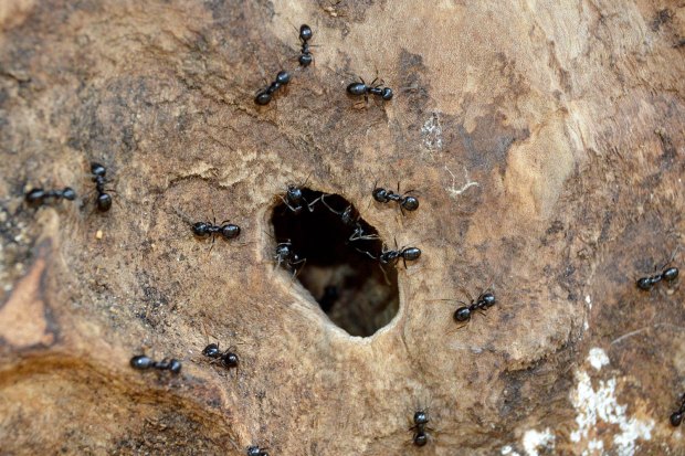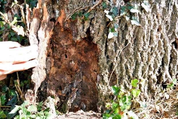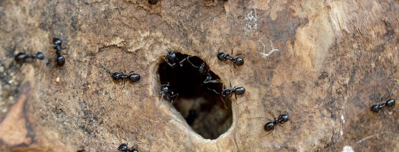 Dato importante es que esta especie especie está clasificada dentro del subgénero Dendrolasius, palabra compuesta por dendro que significa árbol en griego. Y esto indica que Lasius fuliginosus construye sus nidos en los árboles. Sabido esto, si se sigue una hilera de obreras, se encuentra el árbol donde se ubica la colonia. Y esto hice. En la imagen número 2, se puede ver indicado el árbol. Pude ver que por su tronco trepaba una hiedra (figura 3), signo inequívoco de que pocos años le quedaban de vida. El nido es construido en la base y ocupa un buen espacio tanto por debajo del nivel del suelo como por encima. Las obreras poseen unas fuertes mandíbulas con las que labran la madera y construyen las galerías. En principio, no dañan al árbol, ya que aprovechan las partes muertas para entrar y se instalan en el corazón.