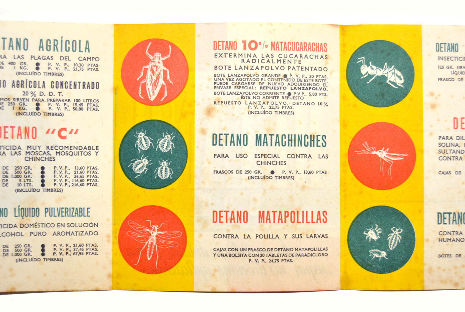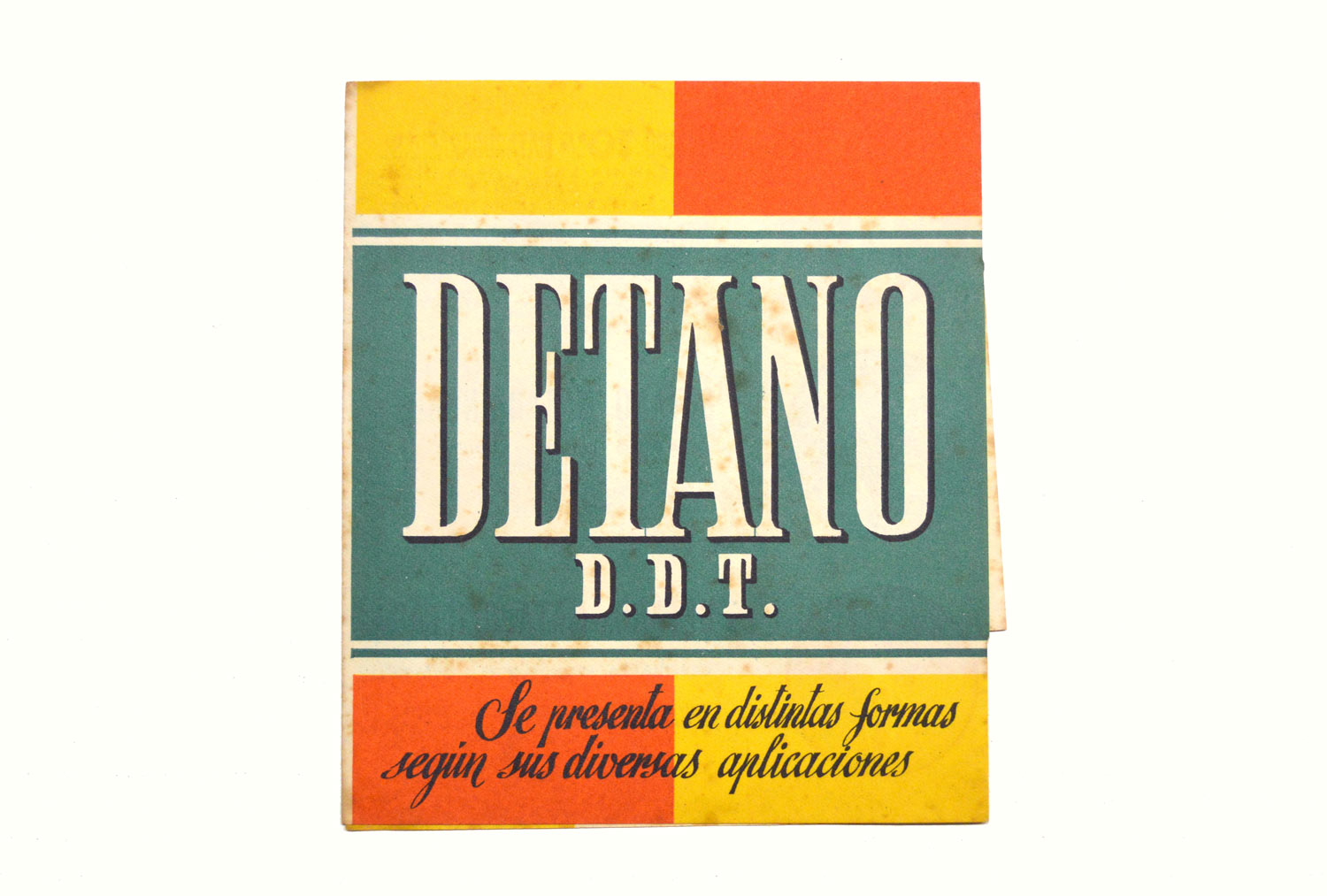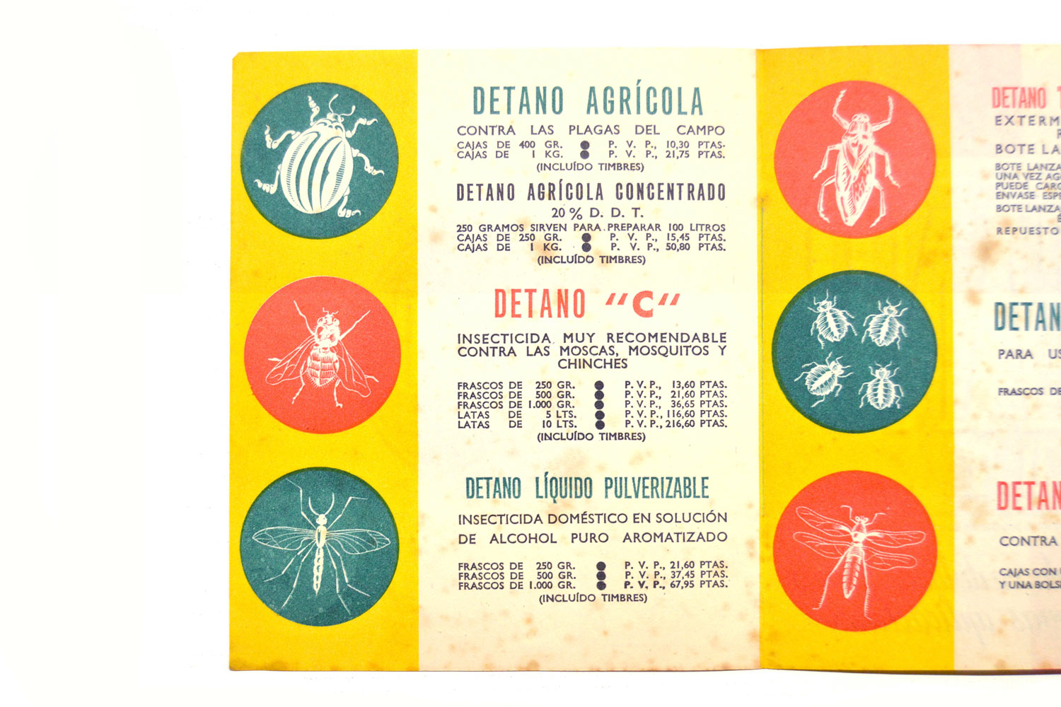 Destaco dos productos. Por un lado, DETANO LÍQUIDO PULVERIZABLE cuyo DDT estaba en solución de alcohol puro aromatizado. Deduzco que al pulverizar el producto en una habitación, debía quedar rápidamente libre de moscas y mosquitos. Y por otro lado, DETANO ANTIPOLILLAS que era servido en una caja que contenía un frasco de DETANO MATAPOLILLAS y una bolsita con 20 tabletas de paradiclorobenceno. El primero, pulverizado sobre la ropa, servía para cortar de cuajo el ciclo de la polilla. Y el segundo, para prevenir la infestación.
