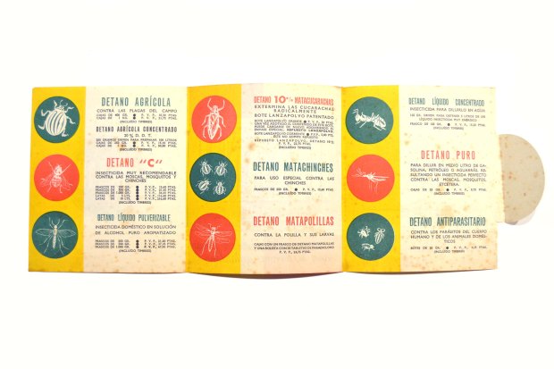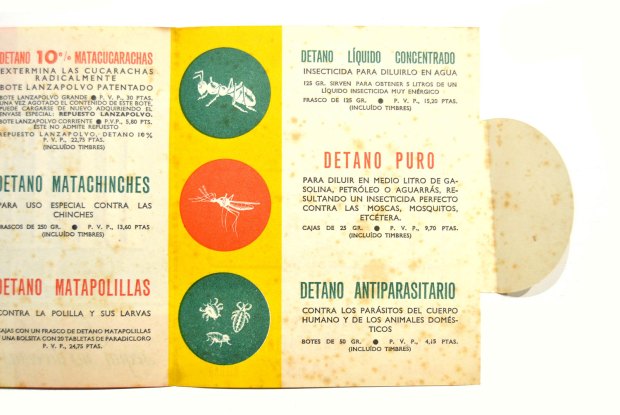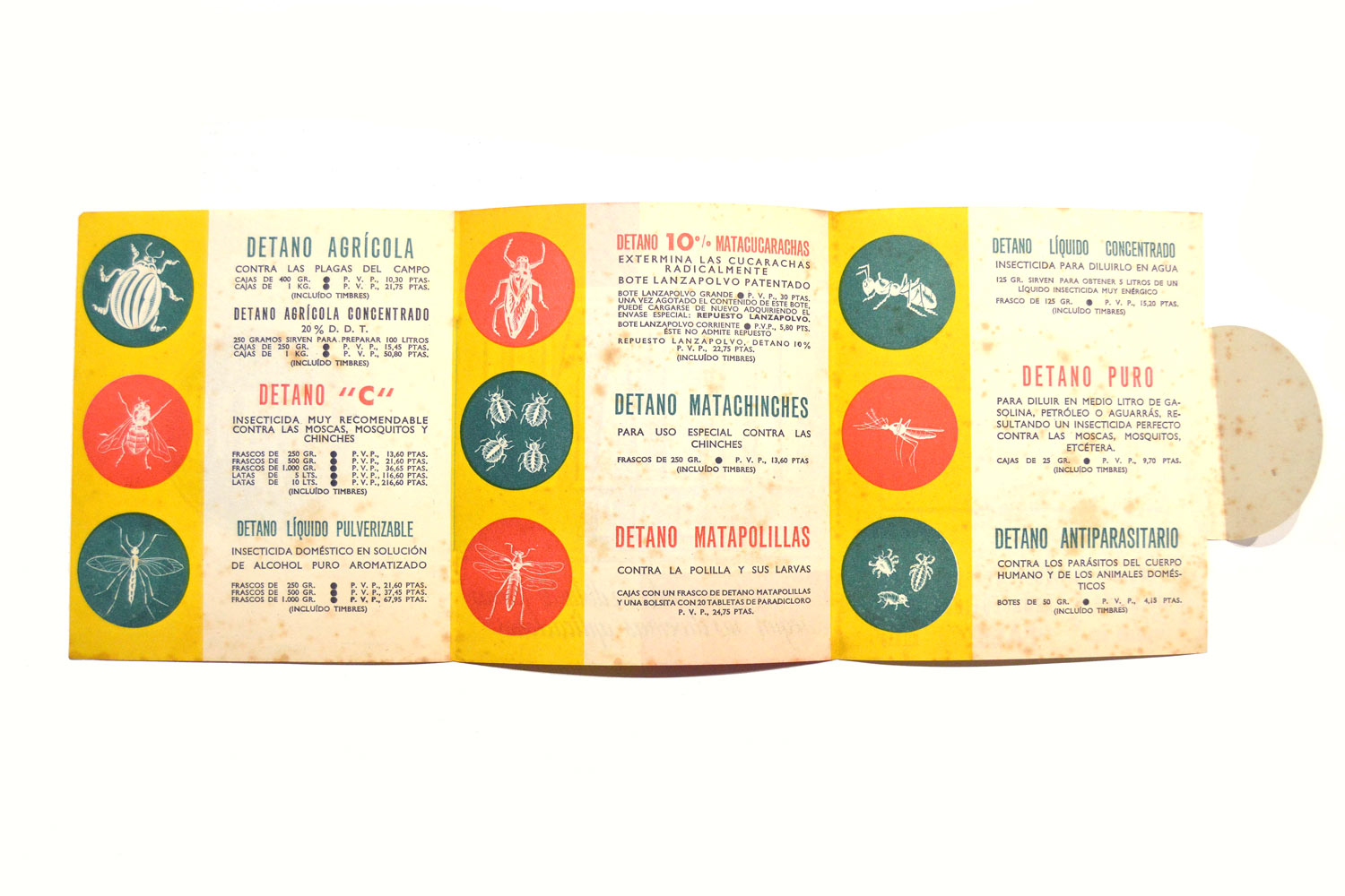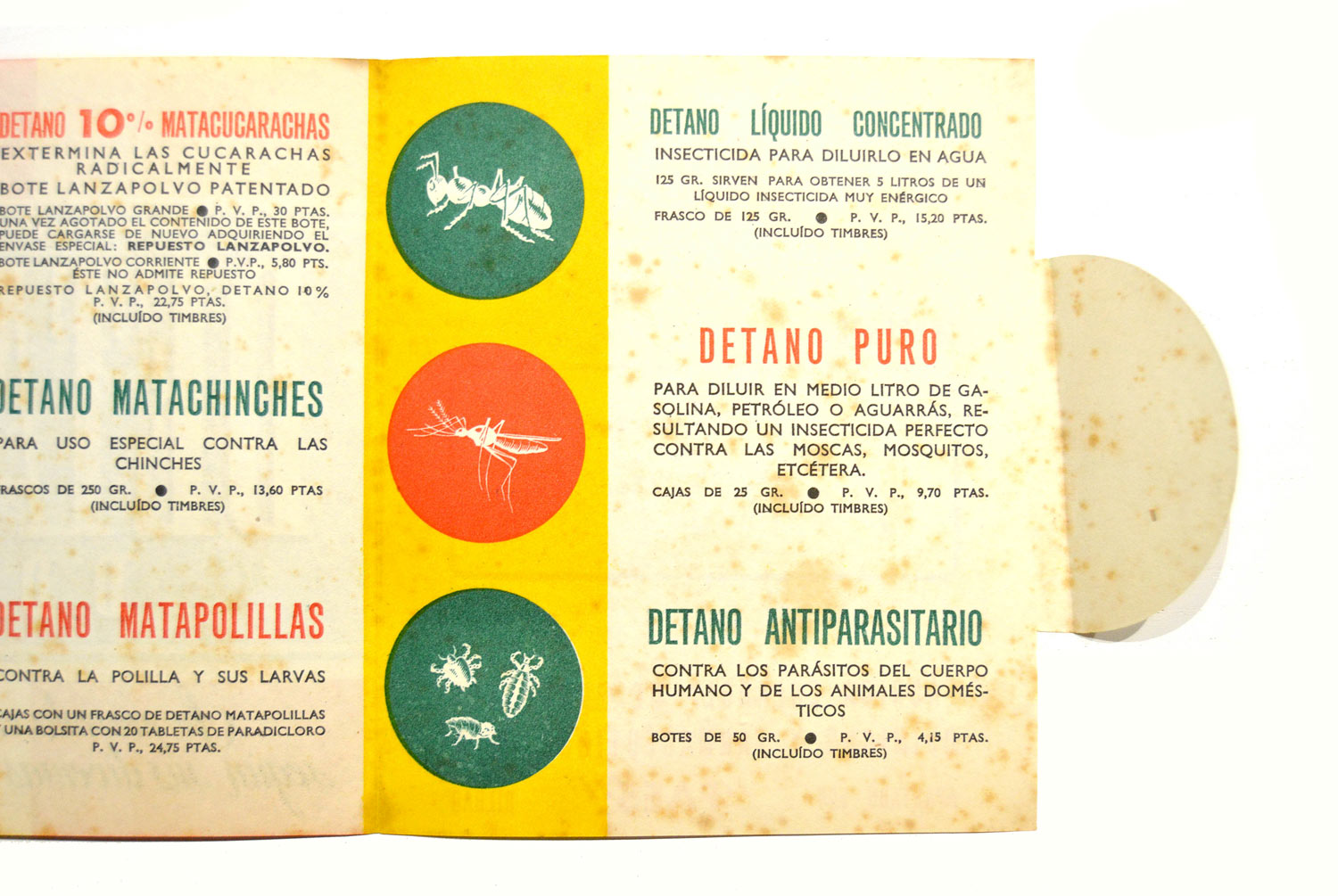 Destaco dos productos. Por un lado, DETANO LÍQUIDO PULVERIZABLE cuyo DDT estaba en solución de alcohol puro aromatizado. Deduzco que al pulverizar el producto en una habitación, debía quedar rápidamente libre de moscas y mosquitos. Y por otro lado, DETANO ANTIPOLILLAS que era servido en una caja que contenía un frasco de DETANO MATAPOLILLAS y una bolsita con 20 tabletas de paradiclorobenceno. El primero, pulverizado sobre la ropa, servía para cortar de cuajo el ciclo de la polilla. Y el segundo, para prevenir la infestación.