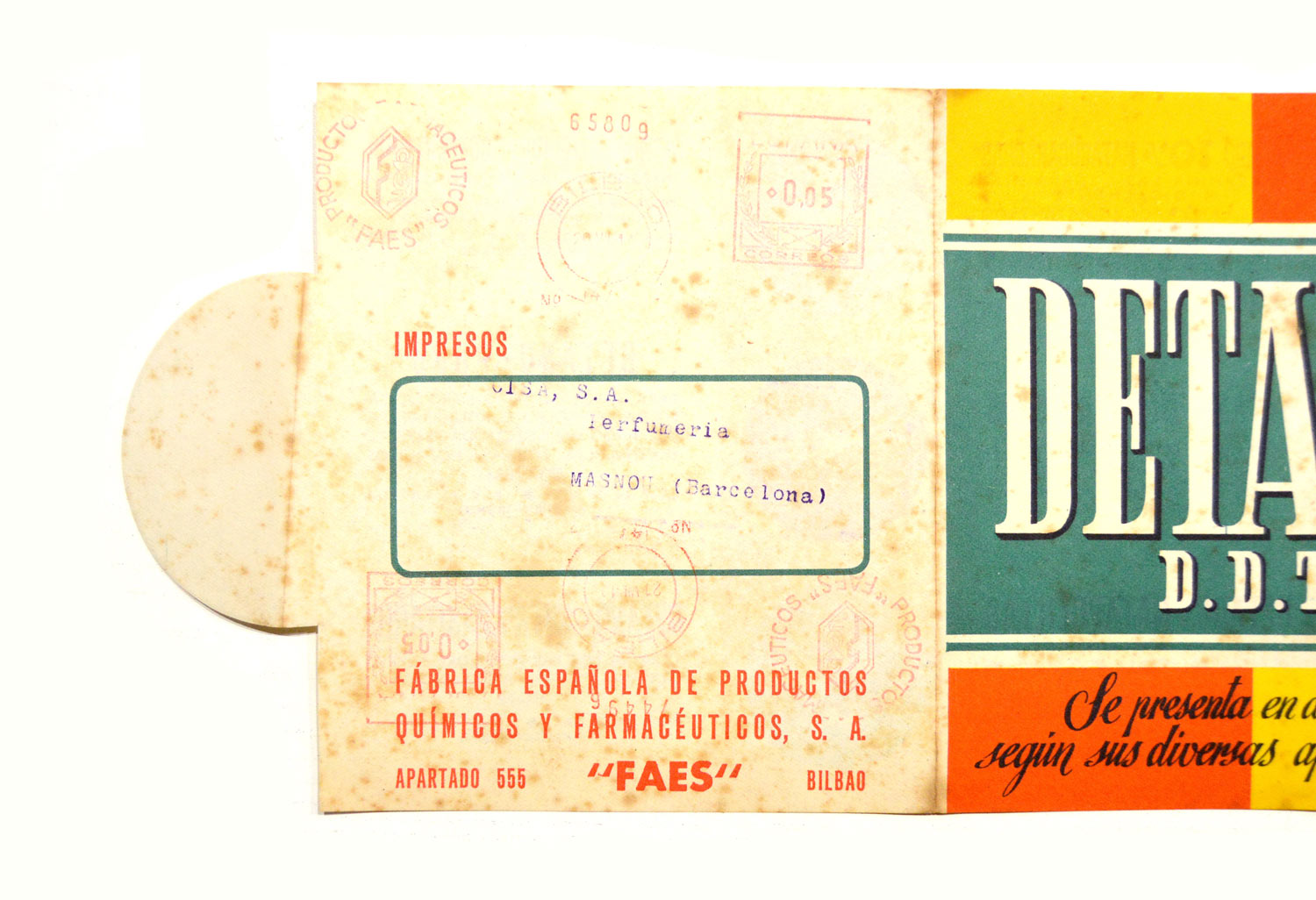 He conseguido un catálogo de 1948 de DETANO, marca comercial de la empresa Fábrica Española de Productos Químicos y Farmacéuticos SA (FAES). En este catálogo se puede ver la gama de insecticidas a base de DDT bajo la marca comercial DETANO. FAES es una farmacéutica todavía en activo que fue constituida en 1933 en Bilbao. Nació como química dedicada principalmente a la fabricación de medicamentos, aunque a partir de la década de 1940 diversificó su cartera con la comercialización de insecticidas para uso agrícola y doméstico. También fabricó otros productos para uso agrícola como herbicidas y anticriptogámicos. Incluso fabricó un raticida de nombre MURITON a base de warfarina [1]. Hay que destacar que FAES no solo formuló sus productos insecticidas, sino que también fabricó sustancias activas. Destaca la producción de DDT que hizo bajo patente propia [2].