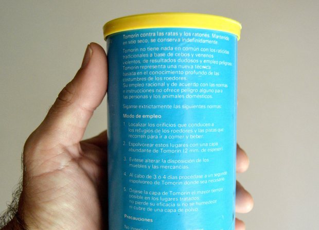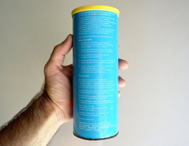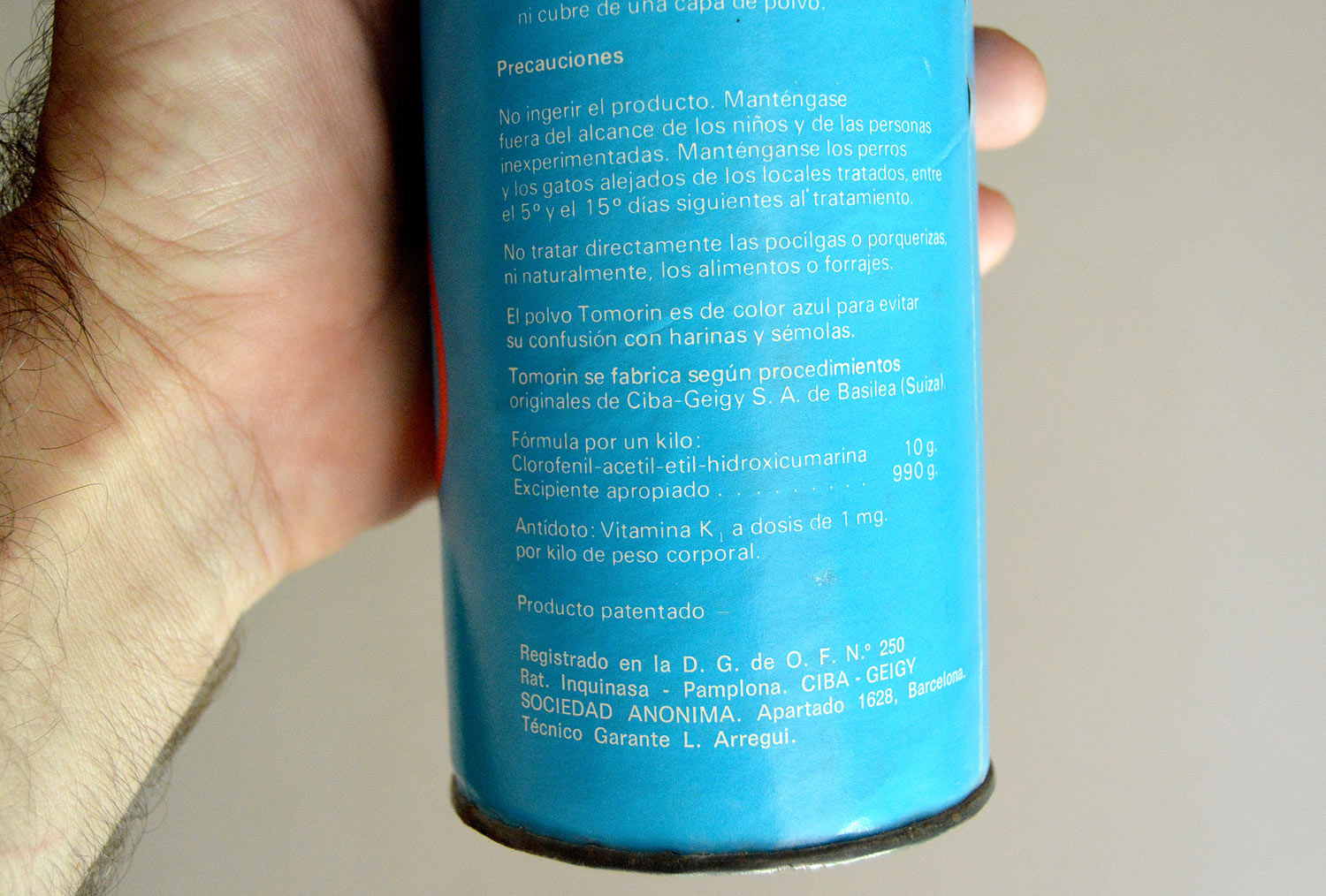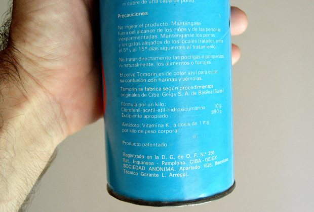 En las imágenes de esta entrada, se puede ver un envase de Tomorin Polvo en detalle con la intención de que se pueda leer bien la etiqueta. El fabricante de este producto es Ciba-Geigy. Por tanto, significa que es posterior a 1970, cuando se fusionaron Ciba y Geigy, dos importantísimas empresas de la química de entonces. Por otra parte, hacia 1983 Ciba-Geigy introdujo un nuevo raticida llamado Lanirat [4]. Este contenía bromadiolona, sustancia anticoagulante de segunda generación, más potente que el cumacloro. Y fue hacia ese año que Ciba-Geigy debió dejar de comercializar Tomorin. Por tanto, el envase de las imágenes es de la década de 1970. Yo creo que de mediados.