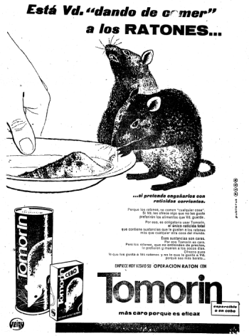 Los productos comercializados por Geigy fueron dos, uno formulado en polvo y otro en grano, tal y como se puede ver en un anuncio de abril de 1960 publicado en el mismo periódico (figura 3). Los nombres comerciales de ambos fueron Tomorin Polvo y Tomorin Cebo. El de mayor éxito fue el primero, ya que era de uso simple. Solo había que espolvorearlo generosamente en las entradas de las madrigueras y en las zonas de paso.