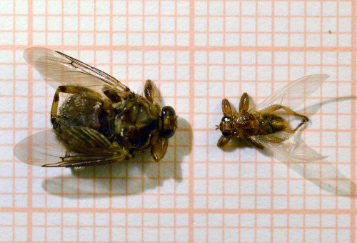 En la imagen número 3, se puede ver un ejempar de Hippobosca equina (izquierda) y un ejemplar de Lipoptena cervi (derecha). Si se observan las alas, se podrá constatar que las de Hippobosca equina están mejor preparadas para el vuelo. Lipotena cervi las utiliza solo para localizar a su hospedador, esto es, un cérvido (Cervidae). A partir de entonces llevará una vida como ectoparásito. El macho y la hembra se encuentran sobre el hospedador. La hembra da a luz a las prepupas, las cuales caen al suelo. Los adultos miden entre 4 y 5 mm. Pueden picar a las personas.