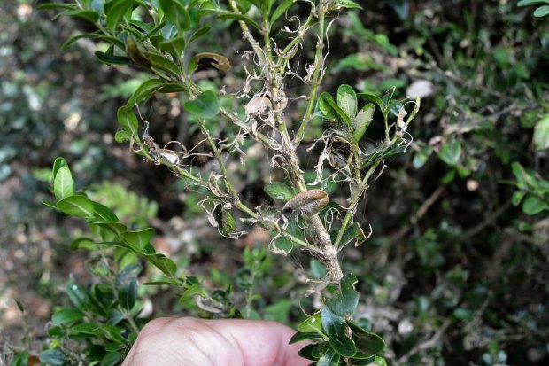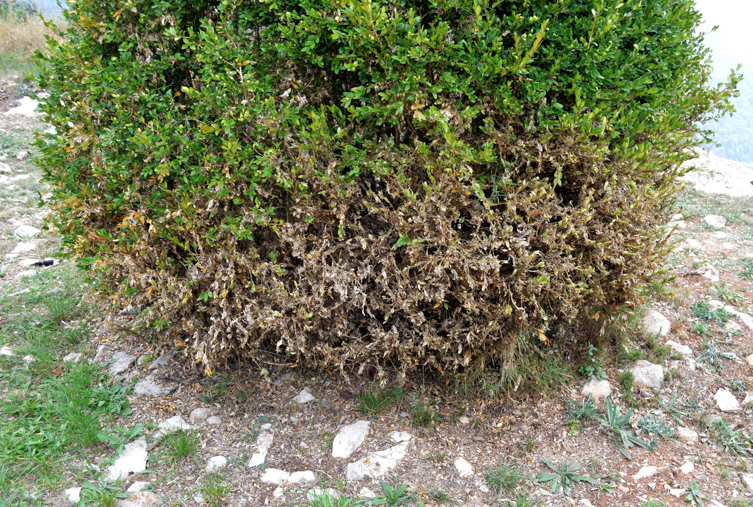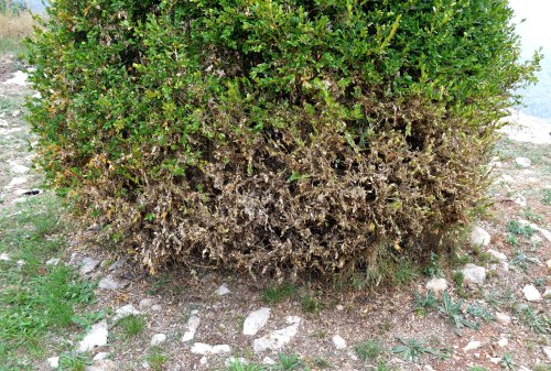 Fig 3. Planta de boj afectada parcialmente por Cydalima perspectalis en Tavertet./ C. Pradera 09-2018