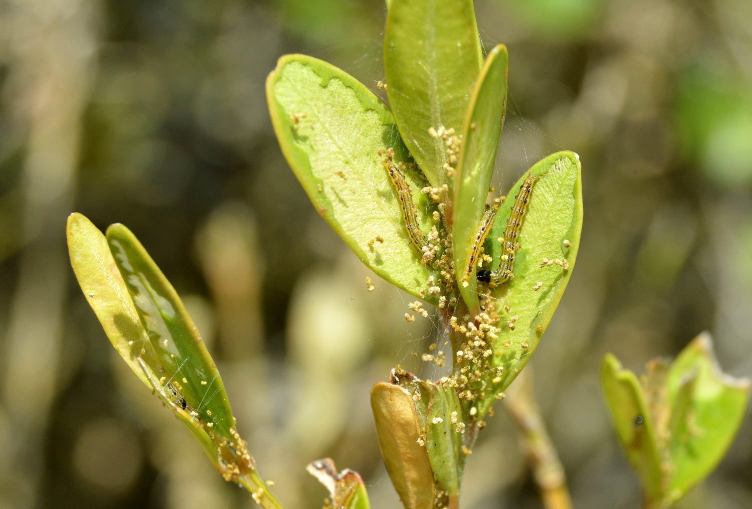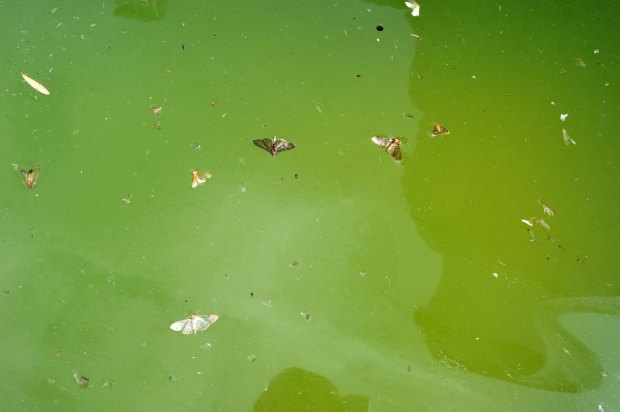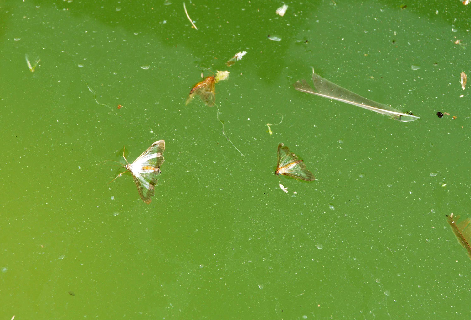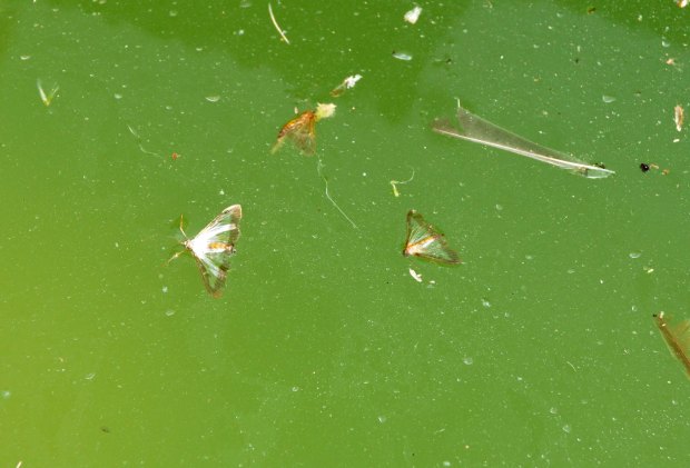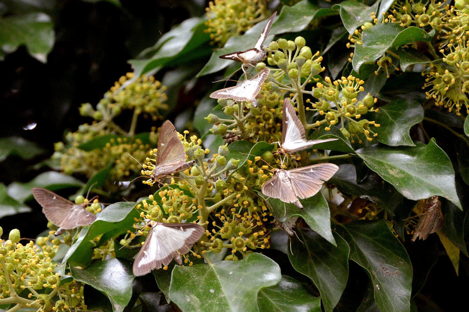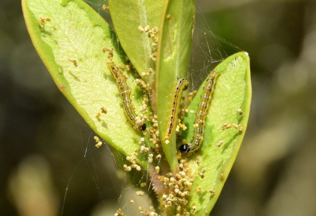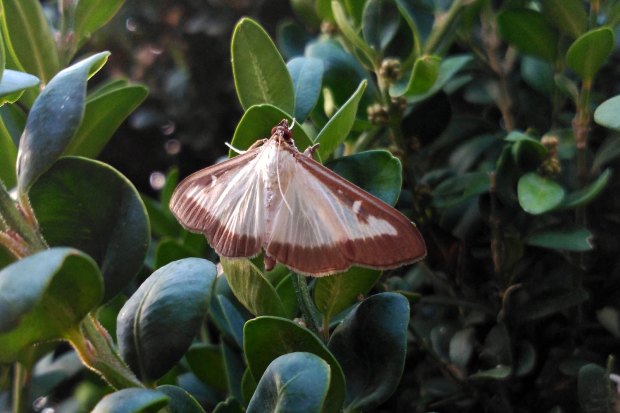 Recientemente, pasé el día en el Collsacabra, un altiplano que se encuentra entre las comarcas de Osona, la Garrotxa y la Selva. Entre Tavertet y Rupit pude ver los estragos provocados por la polilla del boj (Cydalima perspectalis). Caminando por senderos de la zona, vi como alzaban el vuelo numerosos ejemplares de esta polilla. Toda planta de boj común (Buxus sempervirens) estaba afectada en diverso grado, cuando no, arrasada. También pude observar cientos de polillas alimentándose de las flores de la hiedra (Helix), importante fuente de energía para los insectos durante el otoño. En abrevaderos y fuentes se podían ver polillas muertas sobre el agua. De hecho, esta semana en Barcelona pude ver algunos ejemplares de esta polilla en las bandejas de los insectocutores de un cliente que se encuentra cerca del río Besós.
