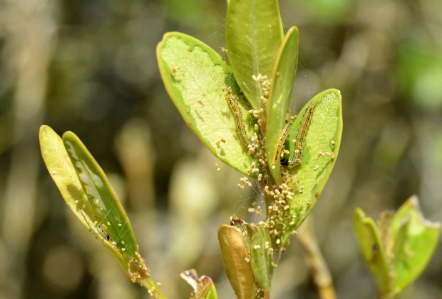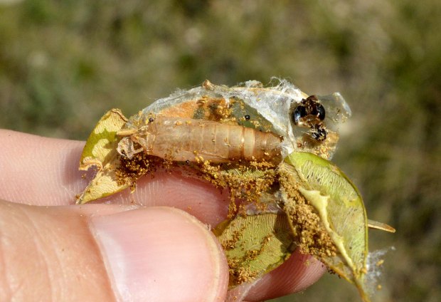 La hembra deposita los huevos en las partes no afectadas de la planta. Los sitúa en el envés de las hojas en paquetes que van de 5 a 20 huevos. Desde el lugar de la puesta, la larva se mueve en un radio de 20-25 cm. Sobre las plantas, se podía ver un gran número de larvas. En las imágenes se puede ver la voracidad de la larva y su capacidad defoliadora. Crece hasta alcanzar los 4 cm antes de pupar. El adulto tiene una envergadura alar de 4 cm. Muestra un patrón (dibujo y color) sobre las alas muy característico.