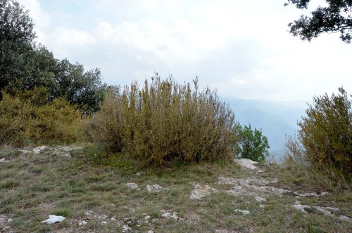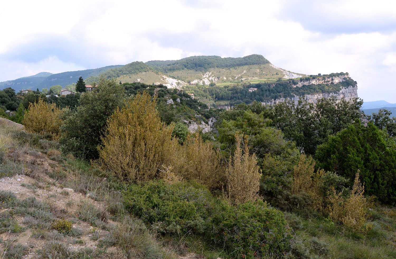 Fig 1. Vista de Tavertet, Osona (Barcelona), con la Rocallarga al fondo. En primer término, bojes afectados./ C. Pradera 09-2018