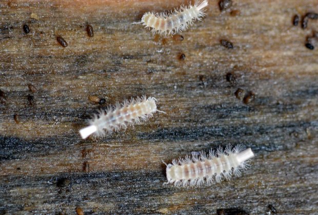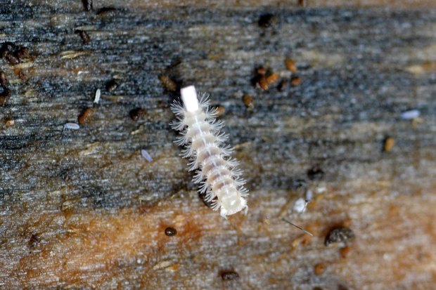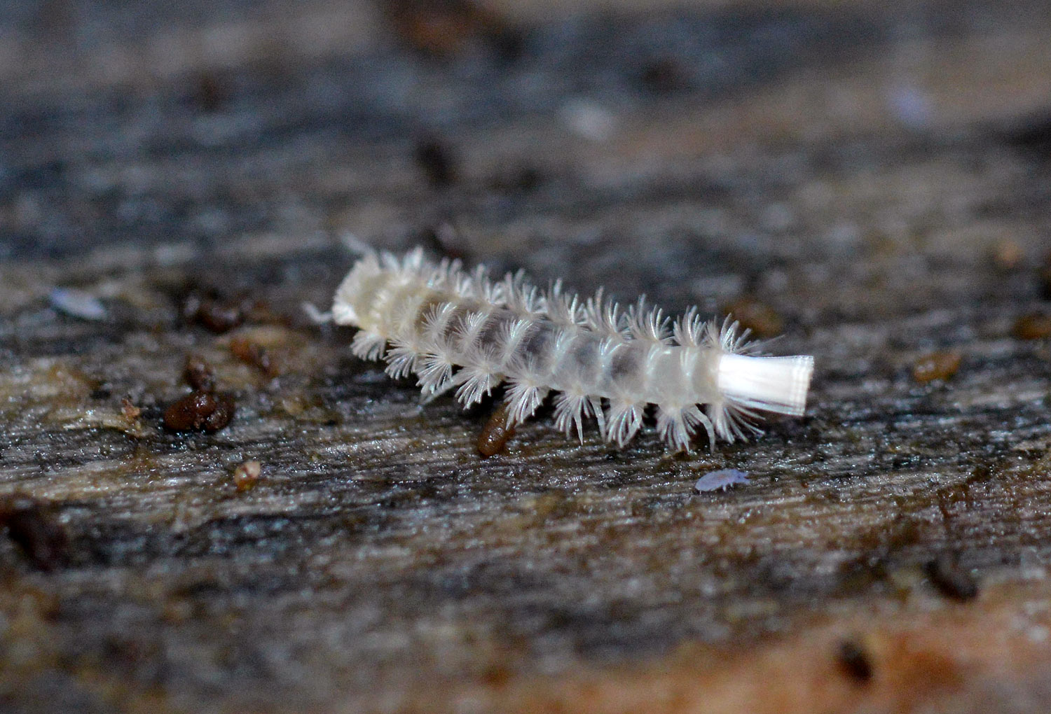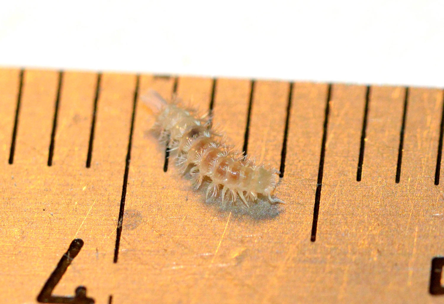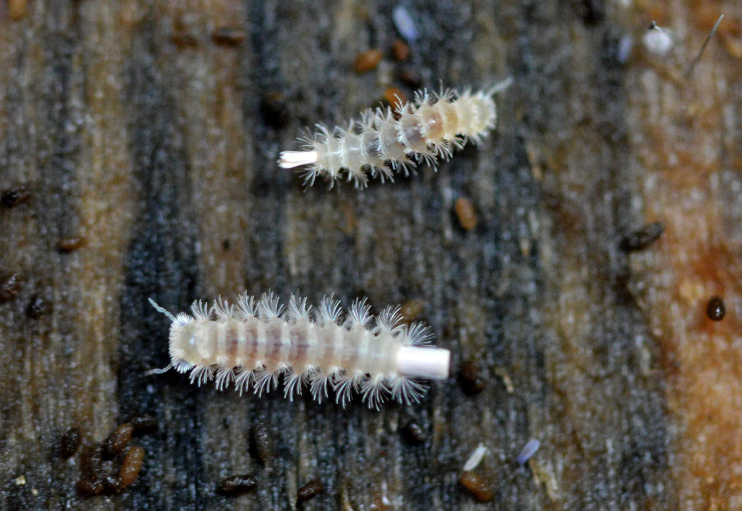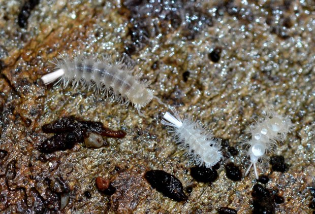 Como se puede ver en las imágenes, son unos seres de gran belleza. Se trata de diplópodos del orden Polyxenida. Los polixénidos se caracterizan por tener un cuerpo blando cubierto de sedas dispuestas en penachos. Miden entre 2 y 5 mm [1]. Todo apunta a que pertenecen al género Lophoproctus de la familia Lophoproctidae. Las especies de esta familia se caracterizan por ser ciegas, ya que tienen una vida endogea. Además de encontrar individuos en el interior de la estación, había debajo de un par de piedras cercanas. Me fijé que en la zona donde se encontraban había mucha humedad. Busqué debajo de piedras unos metros más lejos y no encontré más.