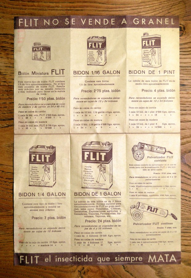 He encontrado un importante e interesante documento para mi archivo. Se trata de un antiguo catálogo de productos de la marca Flit que se presenta como «Nota de Precios» (figura 1). Sitúo este documento a mediados de la década de 1930. El formato es una hoja de tamaño folio (21 x 31 cm) plegada a modo de tríptico. Quien quiera saber algo sobre la historia de esta importante marca de la historia de la industria insecticida, en este blog encontrará una entrada [1]. Apuntaré un dato para entender su relevancia. Con Flit apareció un nuevo formulado que facilitó la aplicación de insecticidas para librar las casas de insectos perjudiciales. Consistía en una mezcla de pelitre en un solvente orgánico (un derivado del petróleo). Era aplicado con un pulverizador de émbolo para conseguir una pulverización de gota fina que se difundía fácilmente en un espacio.