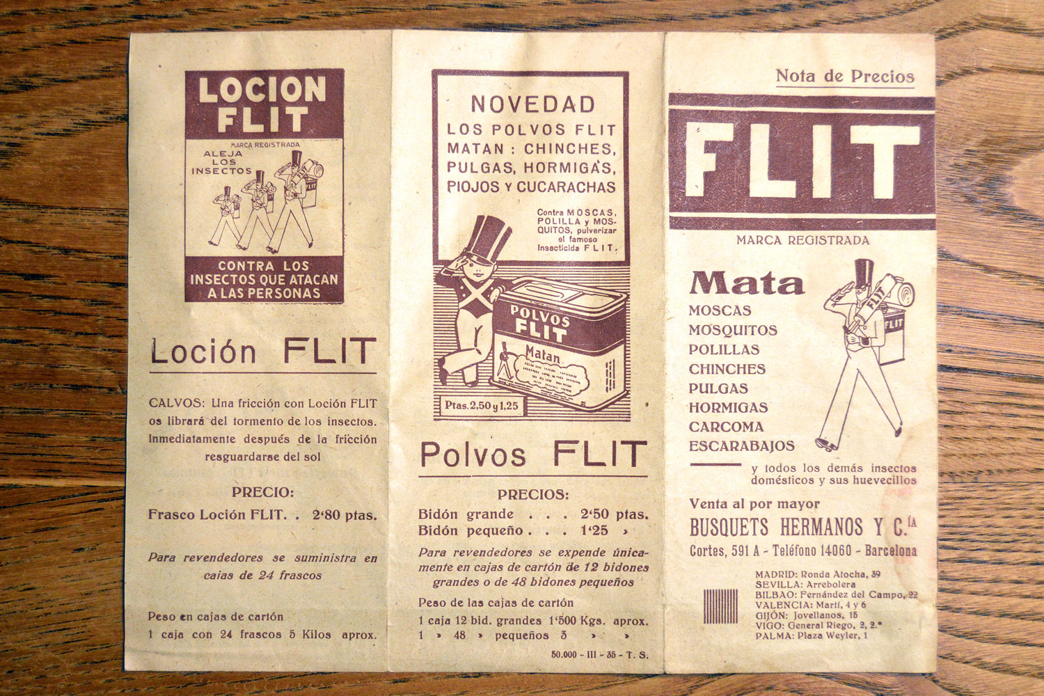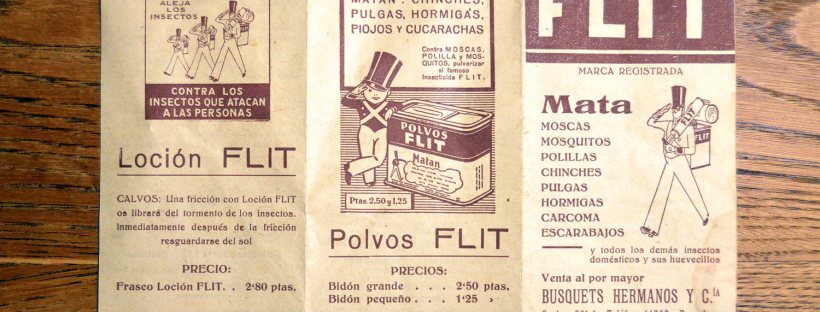 He encontrado un importante e interesante documento para mi archivo. Se trata de un antiguo catálogo de productos de la marca Flit que se presenta como «Nota de Precios» (figura 1). Sitúo este documento a mediados de la década de 1930. El formato es una hoja de tamaño folio (21 x 31 cm) plegada a modo de tríptico. Quien quiera saber algo sobre la historia de esta importante marca de la historia de la industria insecticida, en este blog encontrará una entrada [1]. Apuntaré un dato para entender su relevancia. Con Flit apareció un nuevo formulado que facilitó la aplicación de insecticidas para librar las casas de insectos perjudiciales. Consistía en una mezcla de pelitre en un solvente orgánico (un derivado del petróleo). Era aplicado con un pulverizador de émbolo para conseguir una pulverización de gota fina que se difundía fácilmente en un espacio.