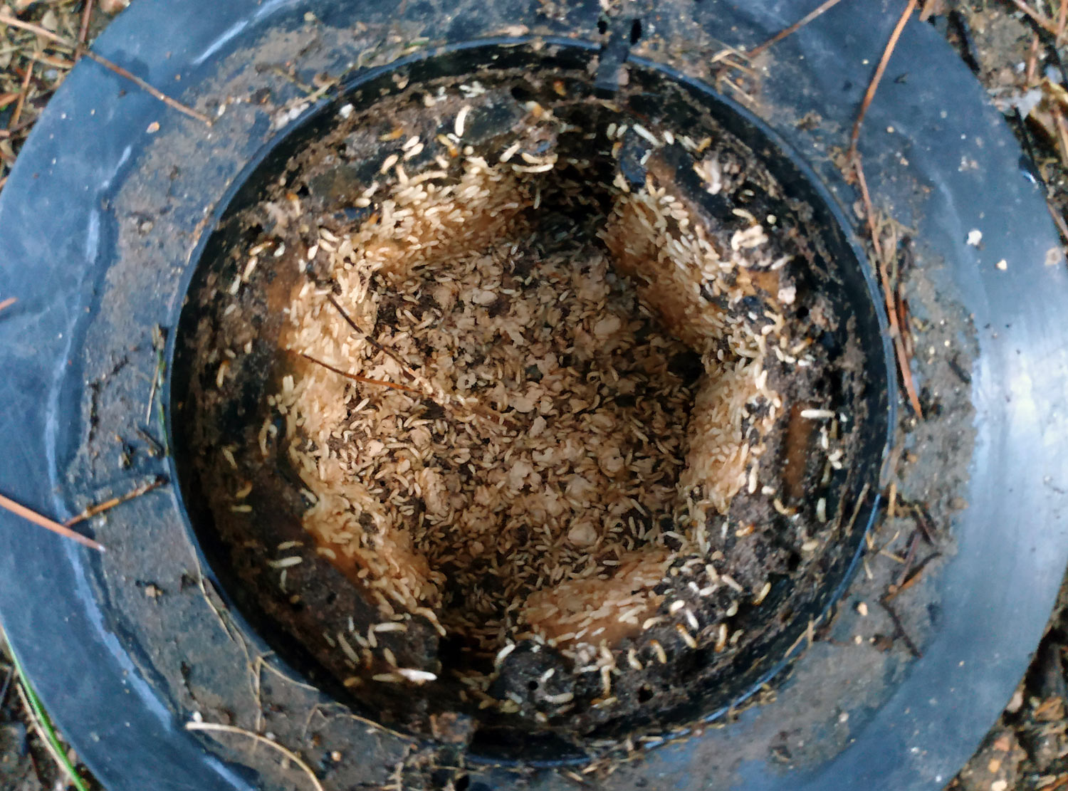 En esta entrada se pueden ver imágenes de un tratamiento mediante el Sistema Exterra de Ensystex [4] que fue implantado el pasado mes de agosto de 2018 en un grupo residencial de viviendas. Fue detectado un foco de termitas en un piso situado en una segunda planta de uno de los edificios. Se habló con los propietarios de la comunidad para que supieran la gravedad de la situación y que esto podría afectar también a otros pisos. Se realizó una inspección alrededor del edificio donde se detectó mucha presencia de termitas. Y también se inspeccionaron los pisos cercanos al piso afectado. No se vieron daños en estos pisos. Se estableció un plan de control para un tratamiento mediante cebos en toda la zona.