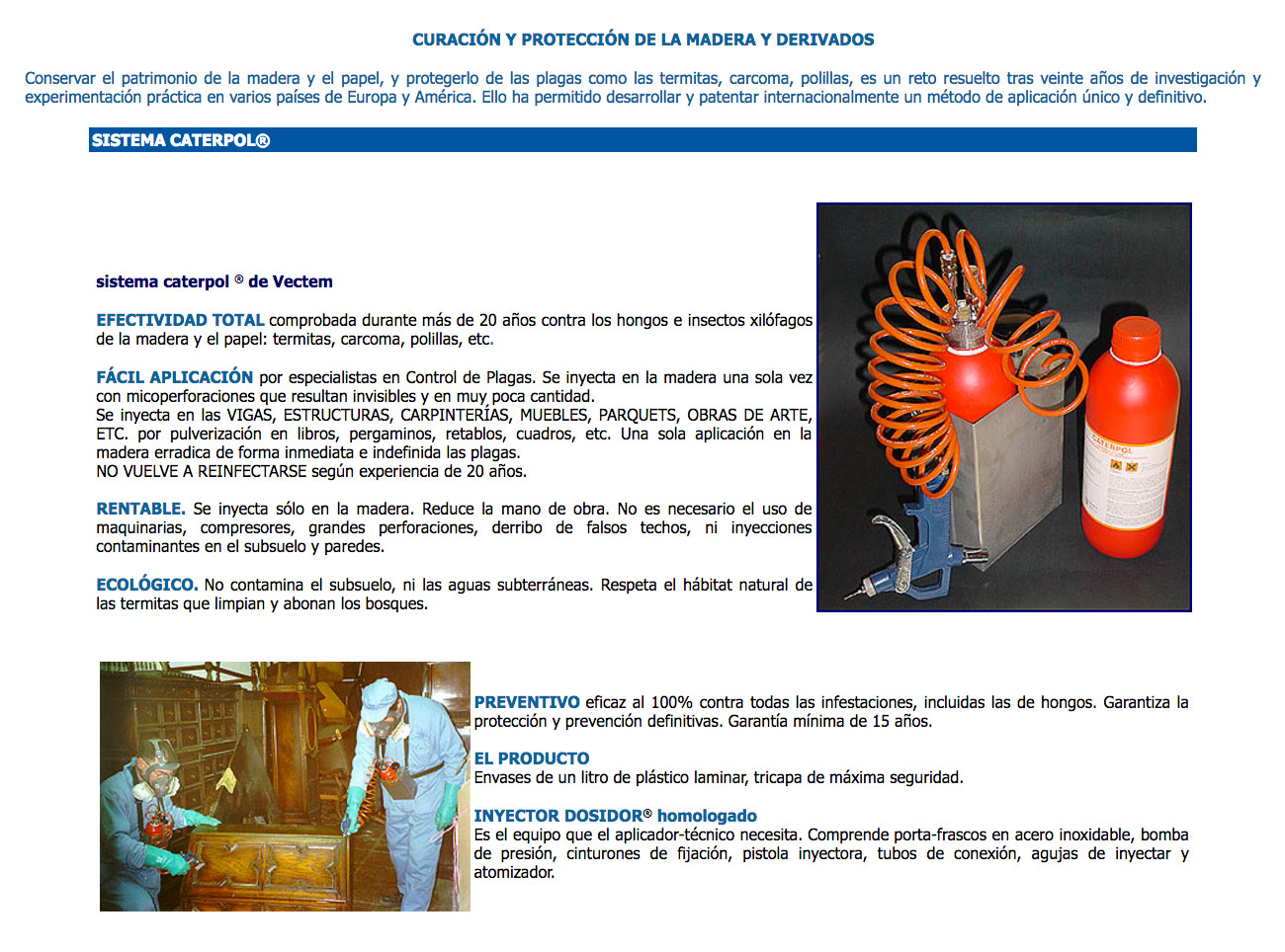 VECTEM publicitaba en su página web en 2003 (figura 3) este sistema como de fácil aplicación en el que «se inyectaba la madera una sola vez con microperforaciones que resultan invisibles y en muy poca cantidad». Esta empresa afirmaba también que «una sola aplicación en la madera erradica de forma inmediata e indefinida las plagas. No vuelve a reinfectarse según experiencia de 20 años». Además era rentable, ya que reducía la mano de obra y no era necesaria el uso de «maquinarias, compresores, grandes perforaciones, derribo de faltos techos, ni inyecciones contaminantes en el subsuelo y paredes».