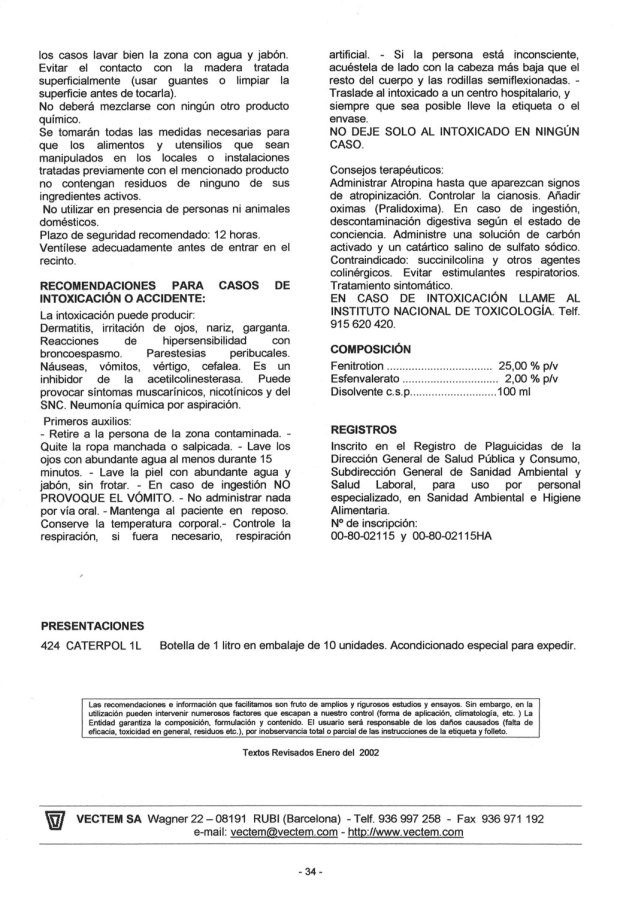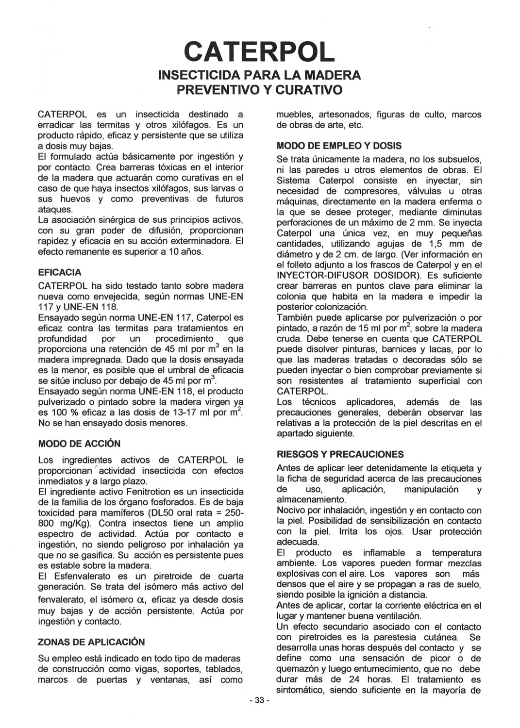 La composición de Caterpol era de fenitrotión al 25%, un organofosforado, y de esfenvalerato al 2%, un piretroide de cuarta generación. Se trata de dos sustancias activas con buena persistencia. Y además, estaban formuladas en un porcentaje elevado. Esto, sumado a un solvente con elevada capacidad de penetración, da como resultado un producto excelente para la conservación de madera. Otra cosa sería la ejecución de los trabajos de inyección.
