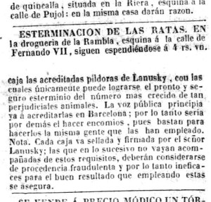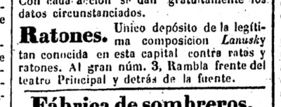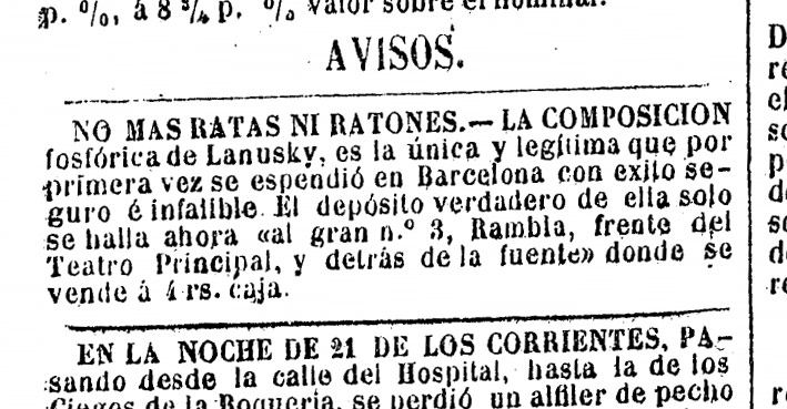 «NO MAS RATAS NI RATONES.- LA COMPOSICION fosfórica de Lanusky, es la única y legítima que por primera vez se espendió en Barcelona con exito seguro é infalible. El depósito verdadero de ella solo se halla ahora «al gran n.º 3, Rambla, frente del Teatro Principal, y detrás de la fuente» done se vende á 4 rs. caja.»