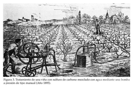 Sin embargo, la popularización del sulfuro de carbono es a partir de 1869 cuando el barón Paul Thenard lo utilizó en Francia contra la filoxera [3]. Fue muy utilizado contra estos parásitos de la vid, para lo cual se inyectaba en el suelo con la ayuda de tubos inyectores diseñados para tal efecto. Se clavaban los tubos en el suelo alrededor de las viñas a una profundidad de entre 30 y 50 cm y luego se inyectaba el líquido (figura 4). Posteriormente, fue utilizado contra otros insectos en plantas. Y fue utilizado con éxito en California por K. W. Hilgard contra roedores en madrigueras.