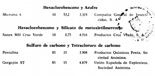En la España de la década de 1960, había dos productos comercializados a base de 85 % de sulfuro de carbono y 15 % de tetracloruro de carbono, según el Registro de Productos y Material Fitosanitario de la época [6]. En la imagen número 6, se puede ver un recorte de la página 115 donde constan ambos productos (figura 6). Uno es Pentalina (Productos Químicos Penta SA) y, otro, Gorgojón ST (Unión Española de Explosivos SA). No obstante, debido a su gran uso, este producto era accesible a los agricultores comprado fuera del mercado legal.