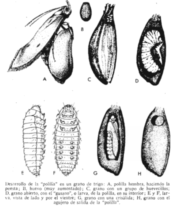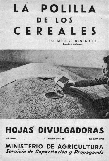 En enero de 1948, en plena posguerra, el Ministerio de Agricultura publicó un folleto informativo titulado ‘La polilla de los cereales’ [1]. Fue redactado debido a que el otoño de 1947 presentó unas elevadas temperaturas que, unidas, «al almacenamiento en malas condiciones (frecuente, por desgracia, en épocas normales, y hoy mucho más, a causa de las previsiones a que obligan la escasez y dificultad de transporte y circulación) han desarrollado extraordinariamente al insecto […]». Y este insecto no era otro que el microlepidóptero Sitotroga cerealella (Gelechiidae).