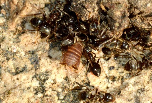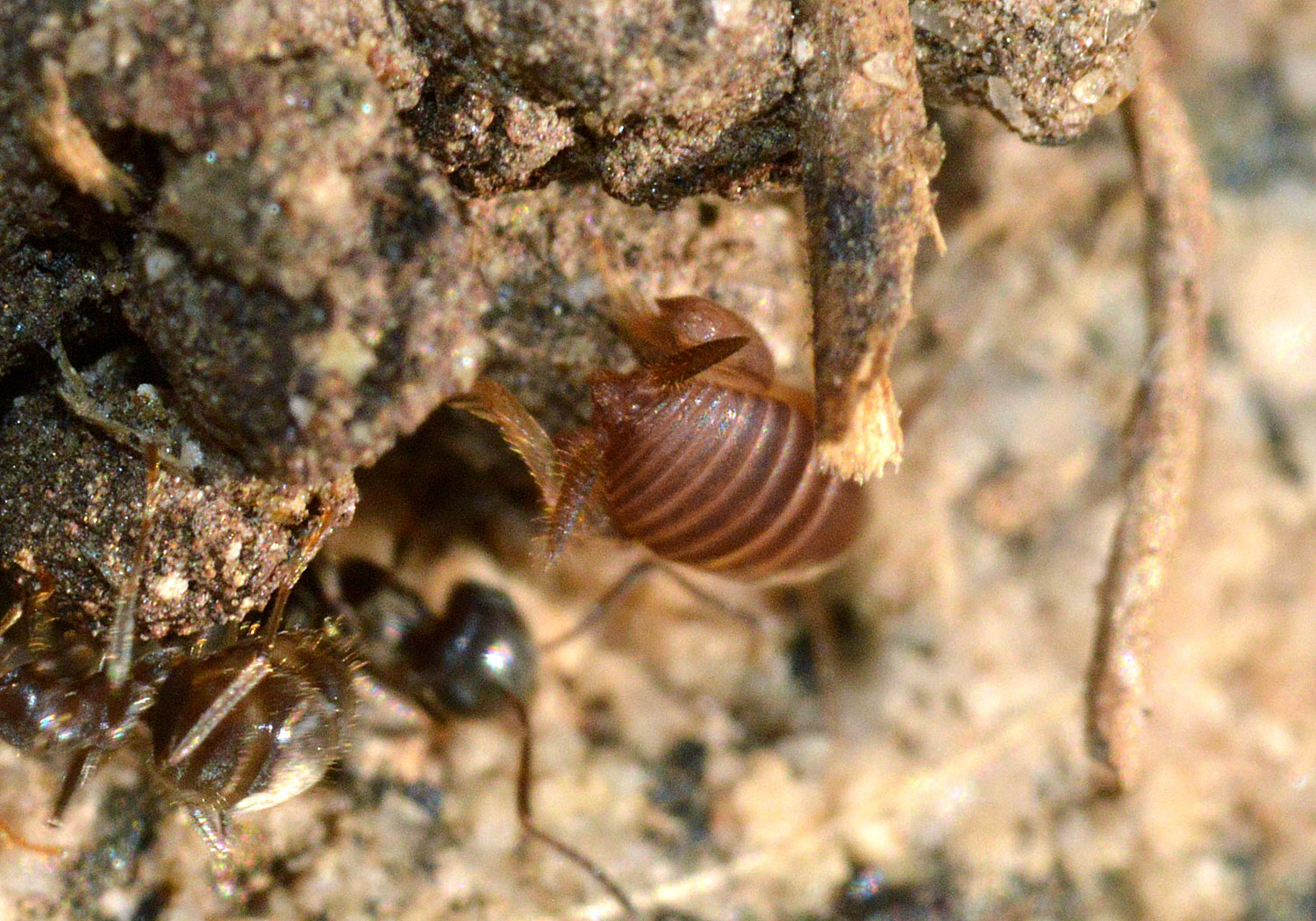 Tenía conocimiento sobre los grillos que completan su ciclo de vida en hormigueros. Tienen una vida dependiente de las hormigas donde encuentran todo lo que necesitan, razón por la que habrán perdido sus capacidad para volar. Como se puede ver en las imágenes son ápteros. Miden aproximadamente entre 2’5 y 3 mm. Y tienen una coloración parda. Estos grillos pertenecen al género Myrmecophilus (Orthoptera, Myrmecophilidae). El nombre fue muy bien escogido, ya que ilustra bien su relación con las hormigas.