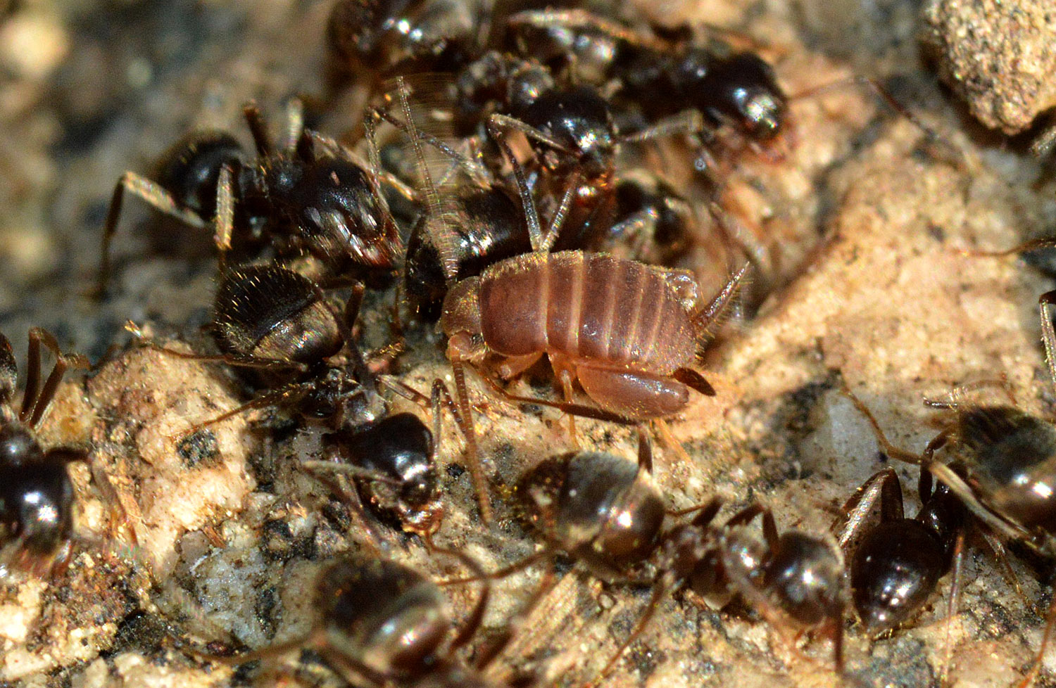 Respecto a los ejemplares que yo encontré cerca de mi casa, hasta donde he podido llegar con la ayuda de mi lupa binocular, pertenecerían a M. fuscus. El artículo de T. Stalling de 2013 explica bien las diferencias entre ambas especies, aunque no es fácil apreciarlas. Respecto a Lasius grandis, hay que constatar que es una especie ibérica en la que Myrmecophilus se encuentra a gusto dada su importante presencia. En el estudio de 2011 de Espadaler y Olmo-Vidal fueron encontrados Myrmecophilus en hormigueros de Lasius, Camponotus, Messor, Monomorium y Tetramorium. Es bien sabido que Lasius y Messor son géneros que tienen abundancia de artrópodos inquilinos. En el artículo de 2015 de Stalling, Espadaler y Ortiz de Zugasti Carrón, se encuentran en hormigueros de Lasius, Formica y Camponotus. Muy interesante es un estudio de 2015 sobre M. acervorum en Eslovaquia que da cuenta de su abundancia por géneros [4]. Sus autores encontraron esta especie en 37 hormigueros de cuatro géneros: Lasius (23), Formica (10), Myrmica (3) y Tetramorium (1). Un 62’10% de los registros pertenecen al género Lasius.