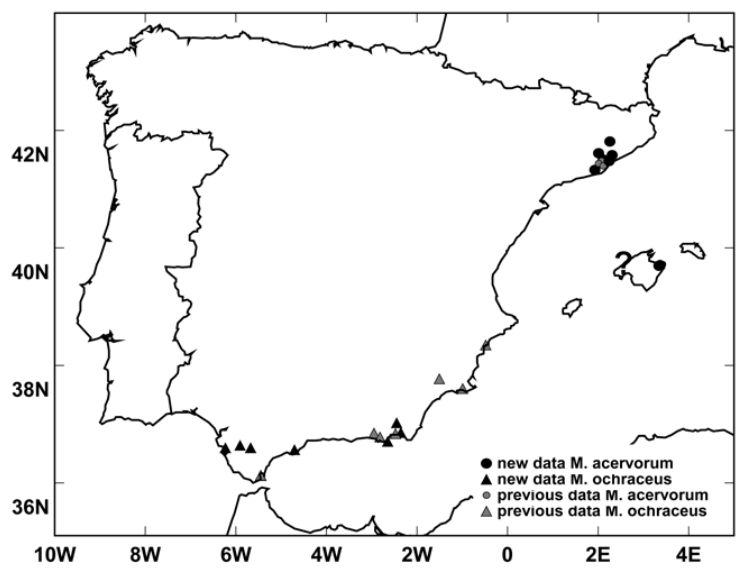 En 2011, Xavier Espadaler y Josep Maria Olmo-Vidal escribieron un artículo muy interesante sobre el género Myrmecophilus en España [2]. Publicaron un interesante mapa con registros de dos especies ibéricas: M. acervorum y M ochraceus (figura 2). Según estos autores, en Cataluña y Baleares se encontraría la especie M. acervorum. Y en Murcia y Andalucía, se encontraría M. ochraceus. Importante asunto era sobre los registros que se tenían de las Islas Baleares. Ambos autores estudiaron un ejemplar de Myrmecophilus encontrado en Artà (Mallorca) en 1921 y depositado en el Museo de Ciencias Naturales de Barcelona. Y llegaron a la conclusión de que se trataba de un ejemplar de M. acervorum. Sin embargo, con anterioridad, otros autores habían identificado ejemplares de Myrmecophilus encontrados en las islas como pertenecientes a M. ochraceus. Espadaler y Olmo-Vidal supusieron que podría tratarse de una mala identificación y que estos ejemplares de M. ochraceus eran en realidad de M. acervorum.