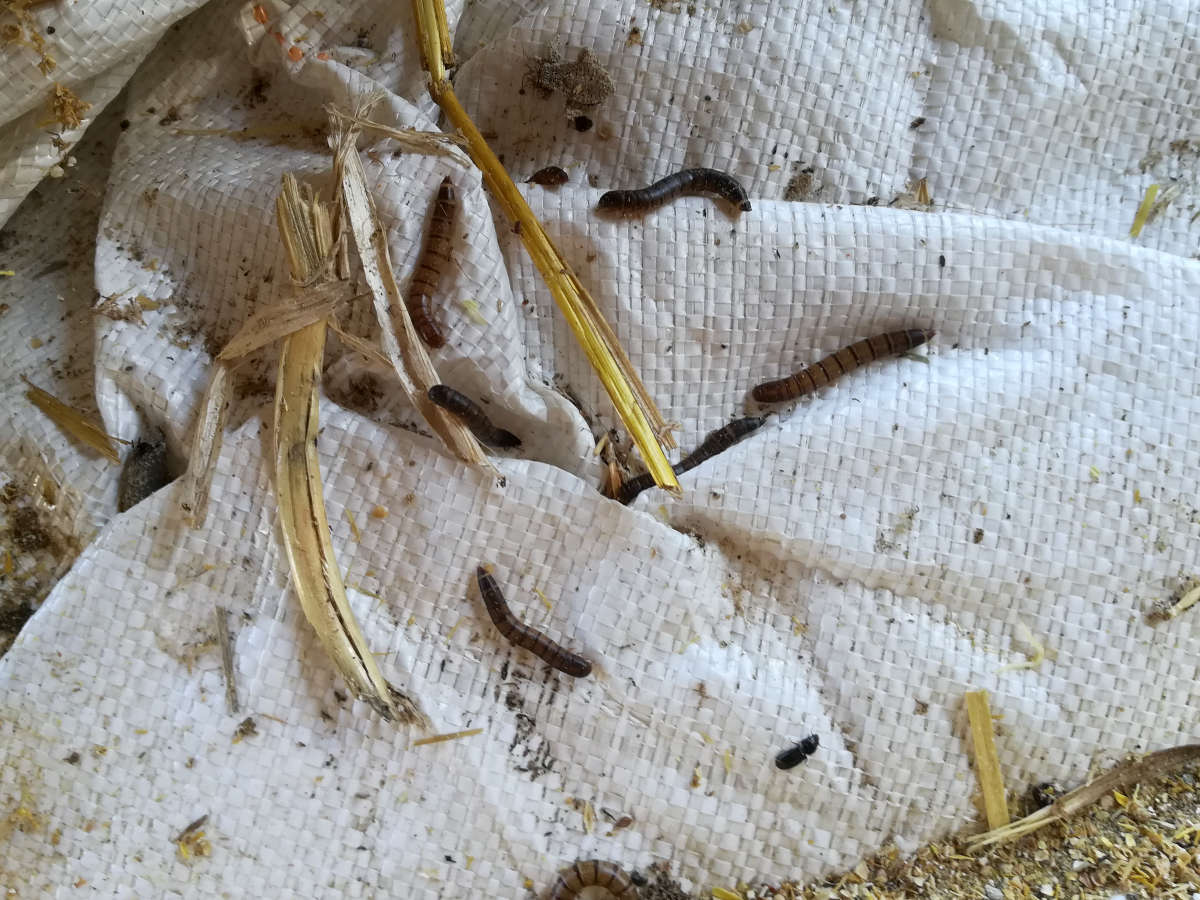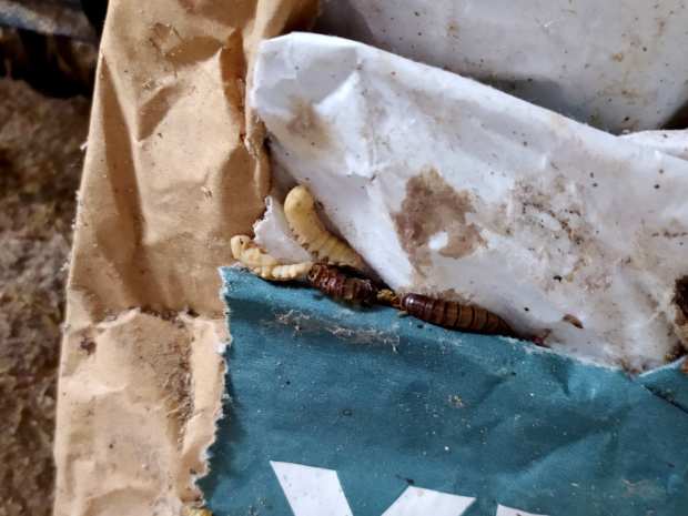 Fig 12. Pupas de Tenebrio obscurus entre los sacos vacíos de pienso en una granja./ C. Pradera 02-2019