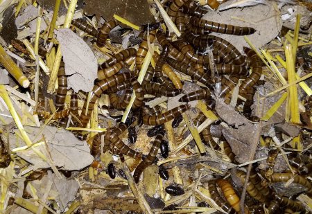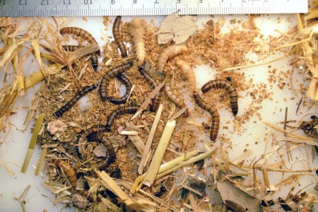 En las imágenes 1 y 2 se pueden dos de las varias fotografías que tomé. Por un lado, había adultos de Alphitobius diaperinus que, cuando se vieron descubiertos, empezaron a correr. Y por otro, había unas larvas de gran tamaño de color rojo amarillo con bandas rojas. Aproveché que llevaba un frasco de plástico en el bolsillo de la chaqueta y recogí un buen número de larvas. Pensando en su supervivencia, pensé que lo mejor era recoger el material sobre el cual se habían instalado. Así que fui a buscar una bolsa y recogí paja.