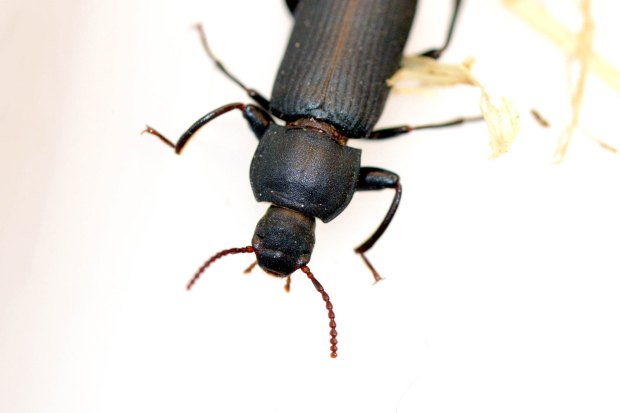Al llegar a casa, metí la muestra y la paja en una caja. Y a lo largo de dos meses, he ido observando de vez en cuando e vez en cuando en su interior. Hace 15 días vi pupas. Y esta semana he podido ver que la gran mayoría de larvas se habían transformado en unos bonitos escarabajos negros. Separé algunos para tomar fotografías y poder identificarlos mejor. Me pareció al principio que se trataba de la especie Tenebrio molitor. Pero poco después, me di cuenta de que eran Tenebrio obscurus. Ambas especies son cosmopolitas, es decir, que tienen una distribución mundial. Se trata de especies, principalmente, sinantrópicas. Son bien conocidas como plagas secundarias de los productos almacenados, ya que atacan aquellos alimentos que están previamente degradados por otros insectos. Son una plaga importante de la harina, razón por la cual son llamados gusanos de la harina. En inglés se utiliza la denominación mealworm beetle para la primera especie y, dark mealworm beetle, para la segunda.