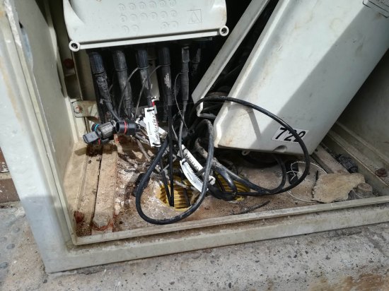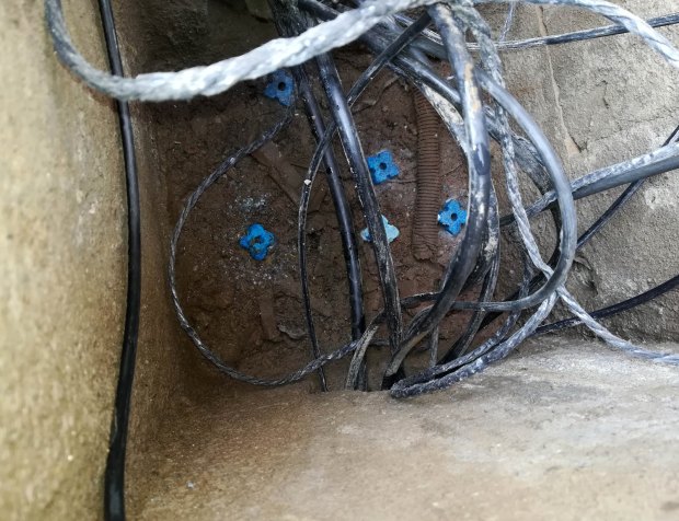 Fig 12. Cables afectados por roeduras en un registro subterráneo de fibra óptica./ C. Pradera 04-2019