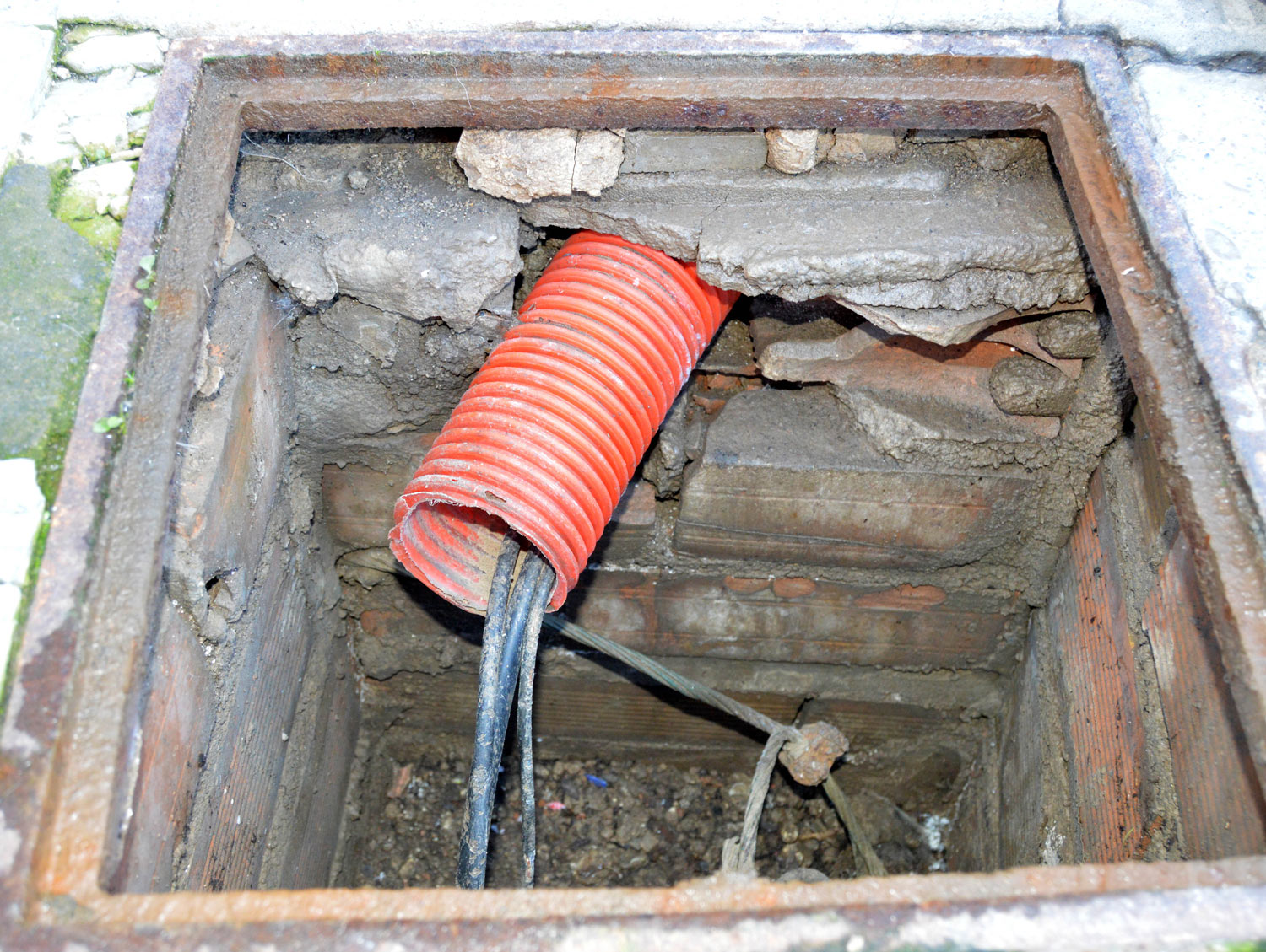 Por otro lado, está el cableado subterráneo que da posibilidades a la rata de alcantarilla (Rattus norvegicus). En las imágenes de esta entrada, doy constancia de cómo esta especie de rata dispone ahora de una nueva vía de circulación. Para llevar la fibra óptica a muchos hogares se levantó el suelo y se hizo pasar un pasatubos flexible de un diámetro por el que las ratas pasan la mar de bien. Además, allí donde no pudieran pasar, la capacidad de roer de estos animales acaban por ensanchar el paso. Un hecho básico, es que el cable de fibra óptica ofrece poca resistencia. Es como mantequilla para los incisivos de una rata. Es poco con lo que entretenerse, pero suficiente para cortar la comunicación.