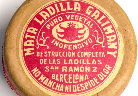 He dedicado diversas entradas a productos antiparasitarios que fueron muy empleados años atrás. Hay parasiticidas de uso genérico contra todo tipo de artrópodos. Y los hay que son específicos como los pediculicidas. Y respecto a estos, hay de más específicos como los insecticidas contra las ladillas o piojos del pubis (Pthirus pubis). En el pasado hubo dos marcas reconocidas que daban cuenta de la problemática que había entonces con tan molestos insectos. Una era el Aceite Yngles [1] y otra el Aceite Brujo [2], a las cuales he dedicado ya su debido espacio. Sin embargo, una marca anterior a ambos fue el Mata Ladilla Galimany. En las imágenes muestro un envase de este producto que fecho de finales de la década de 1910.
