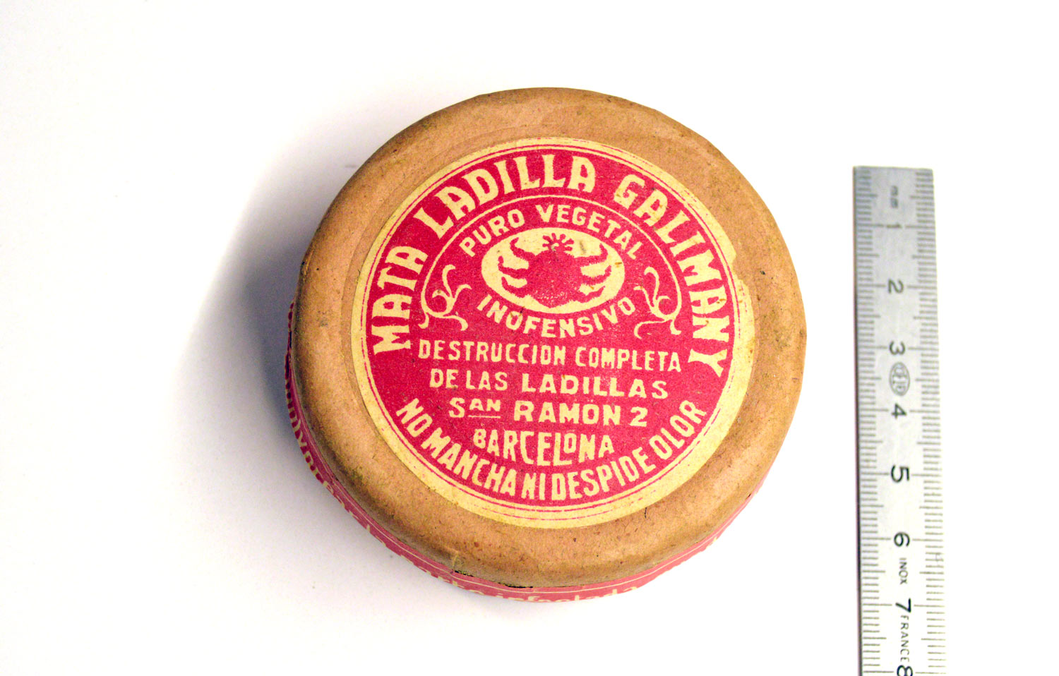 He dedicado diversas entradas a productos antiparasitarios que fueron muy empleados años atrás. Hay parasiticidas de uso genérico contra todo tipo de artrópodos. Y los hay que son específicos como los pediculicidas. Y respecto a estos, hay de más específicos como los insecticidas contra las ladillas o piojos del pubis (Pthirus pubis). En el pasado hubo dos marcas reconocidas que daban cuenta de la problemática que había entonces con tan molestos insectos. Una era el Aceite Yngles [1] y otra el Aceite Brujo [2], a las cuales he dedicado ya su debido espacio. Sin embargo, una marca anterior a ambos fue el Mata Ladilla Galimany. En las imágenes muestro un envase de este producto que fecho de finales de la década de 1910.