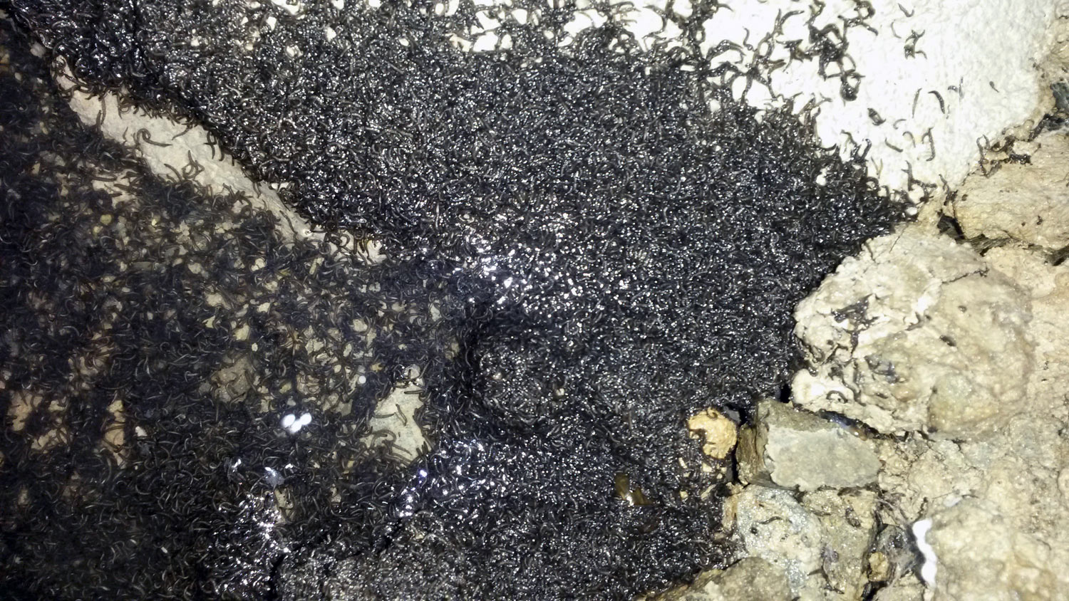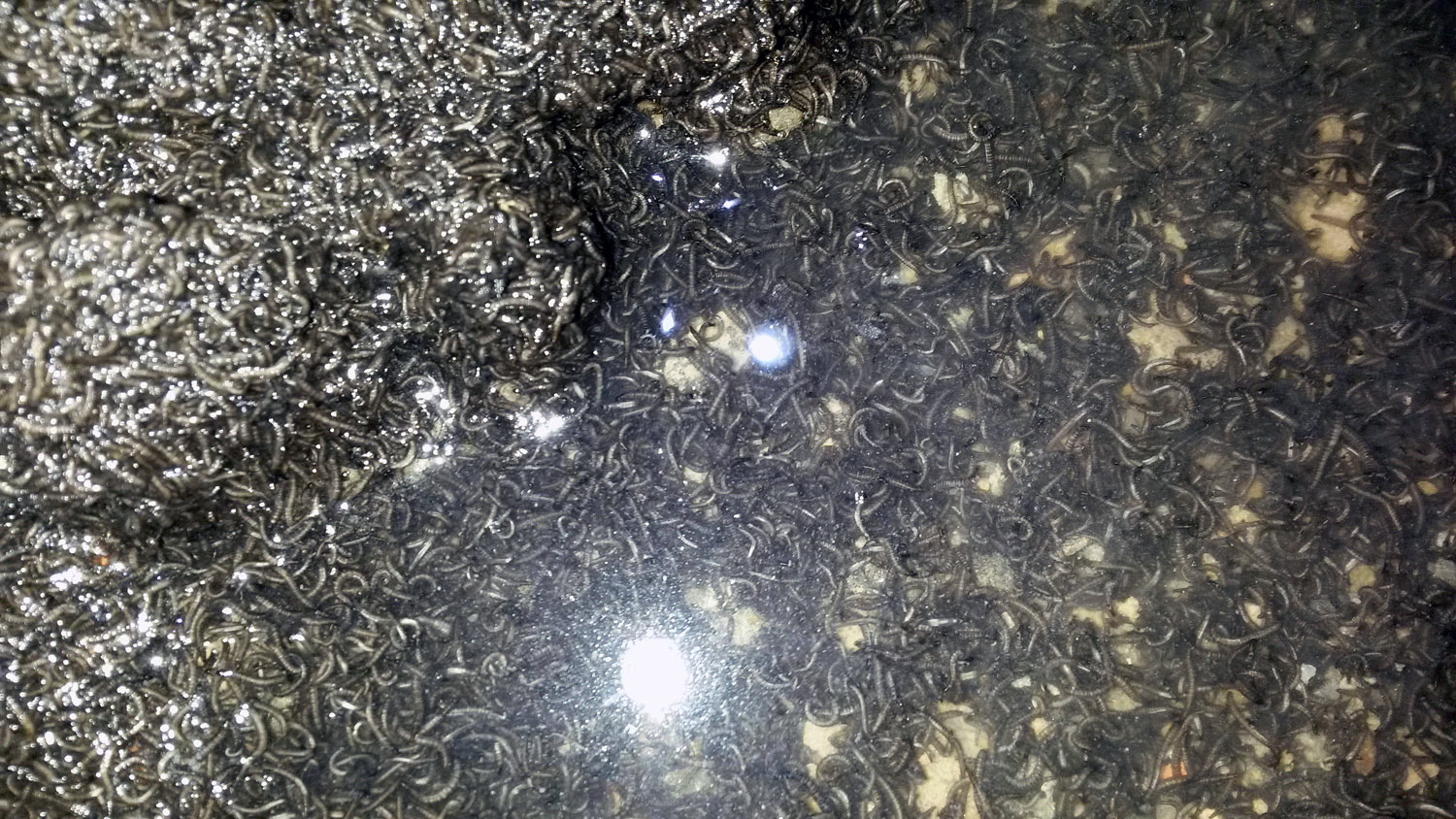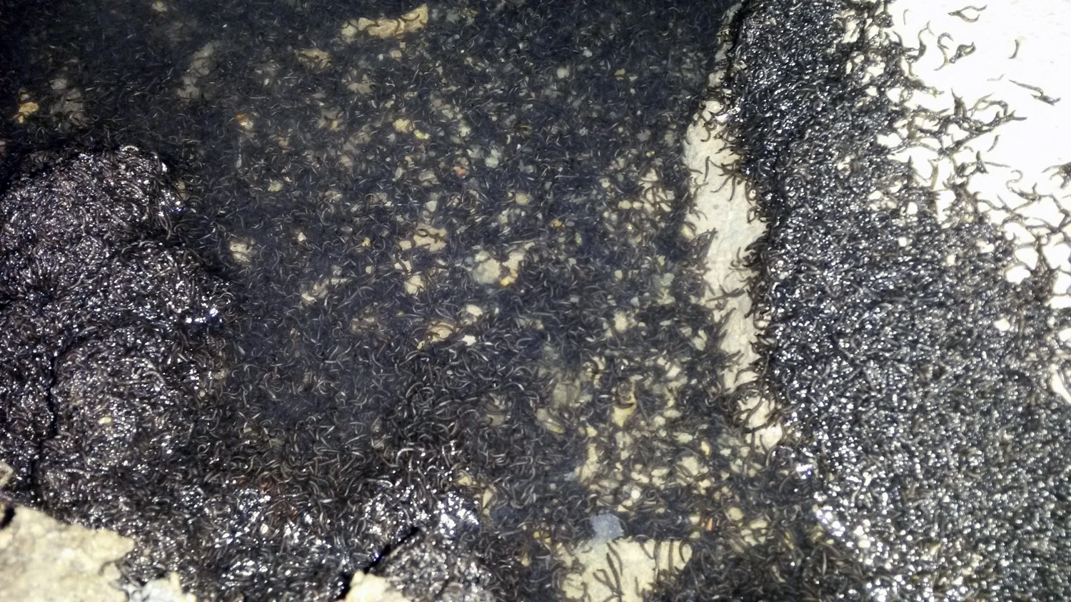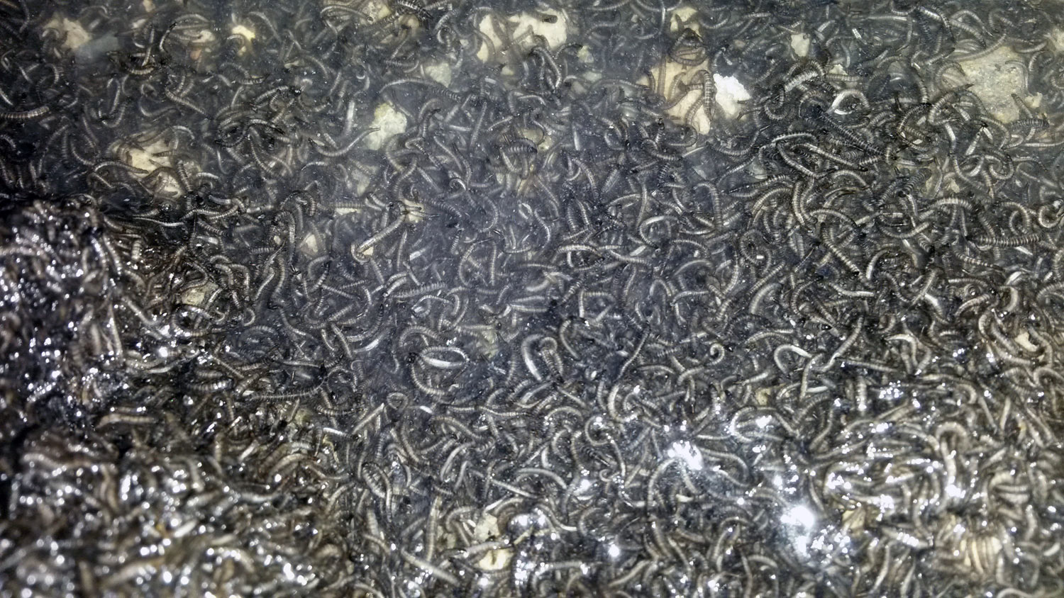 Al bajar a inspeccionar la cámara sanitaria, vimos que la causa raíz era una pérdida del bajante de aguas residuales. Se había formado un pequeño río, debido a la pendiente del terrreno, en el que Clogmia albipunctata se había desarrollado. En la parte final de este río, había algo que nunca antes había visto y que se puede ver en las imágenes. Había miles de larvas de esta especie.