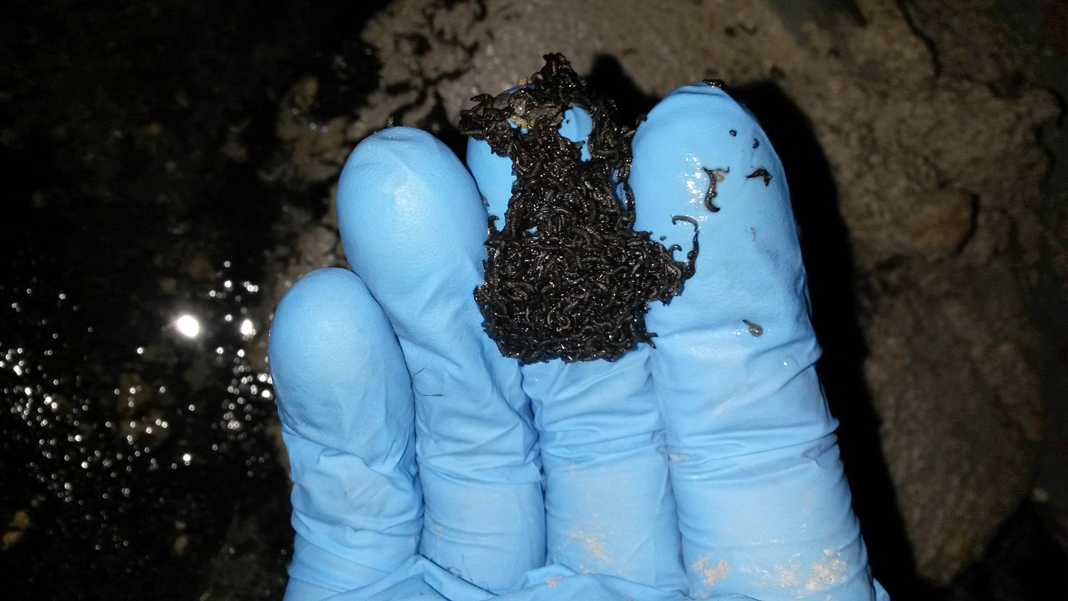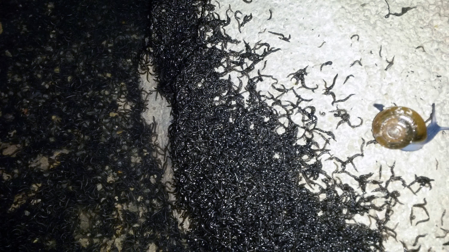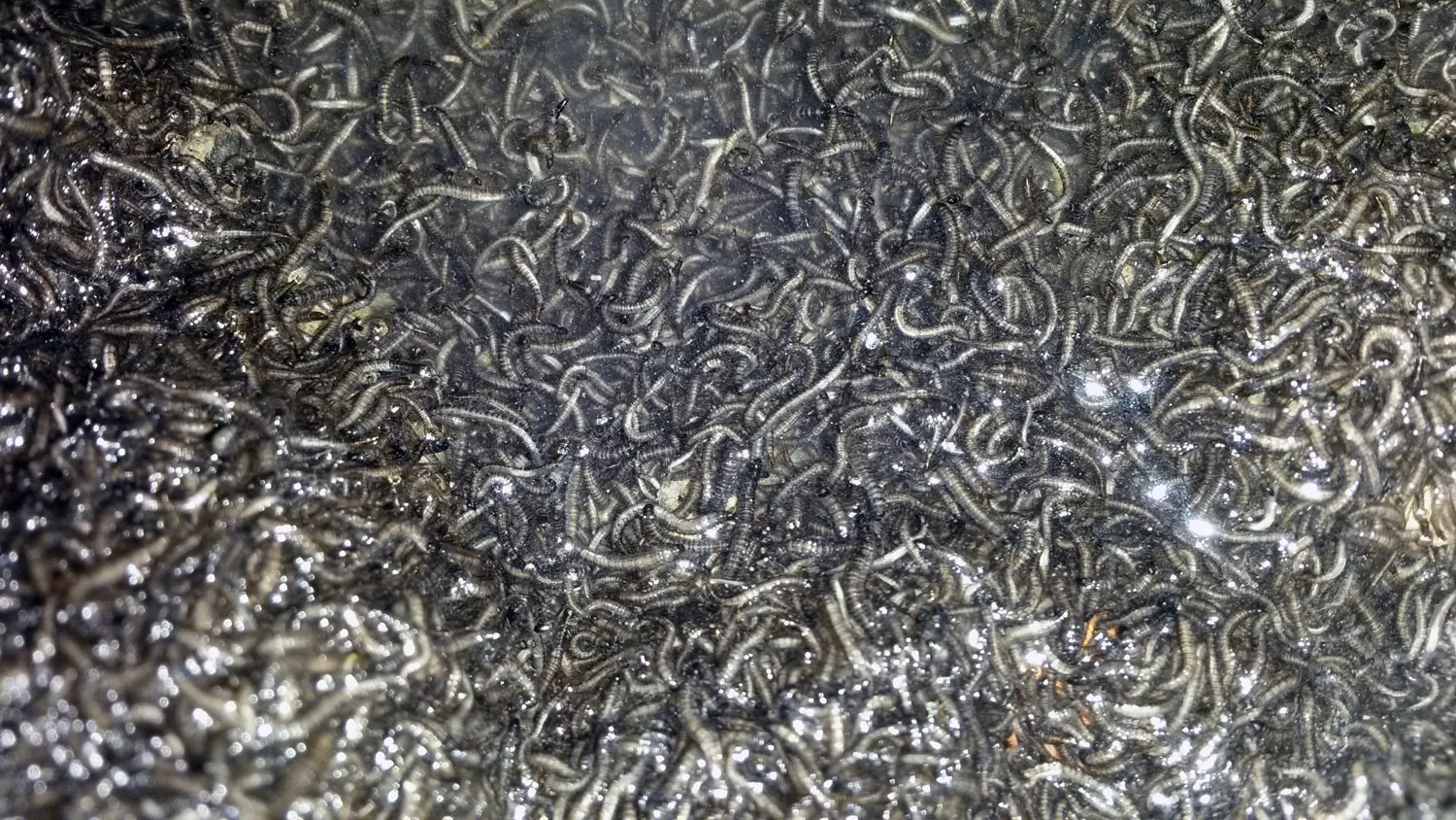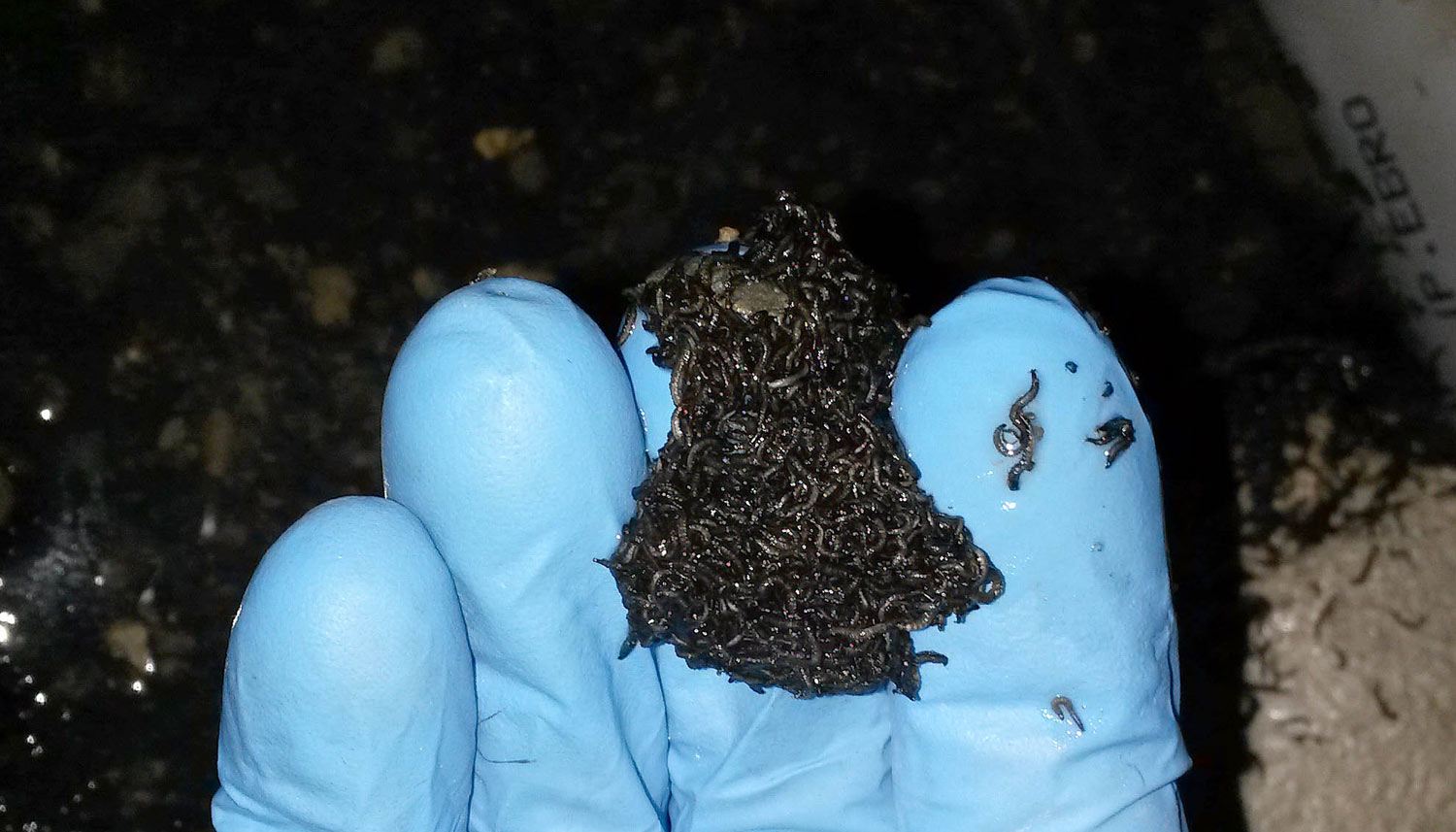 Al bajar a inspeccionar la cámara sanitaria, vimos que la causa raíz era una pérdida del bajante de aguas residuales. Se había formado un pequeño río, debido a la pendiente del terrreno, en el que Clogmia albipunctata se había desarrollado. En la parte final de este río, había algo que nunca antes había visto y que se puede ver en las imágenes. Había miles de larvas de esta especie.