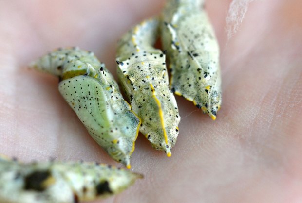 Fig 20. Crisálidas de mariposa blanca de la col (Pieris brassicae)./ C. Pradera 06-2018