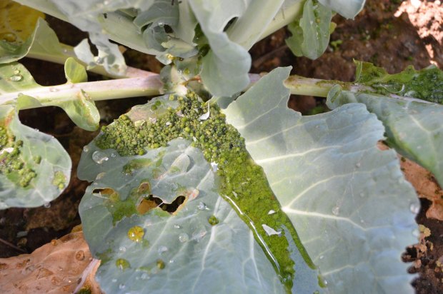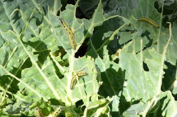 Fig 6. Col atacada por orugas de mariposa blanca de la col (Pieris brassicae)./ C. Pradera 06-2018