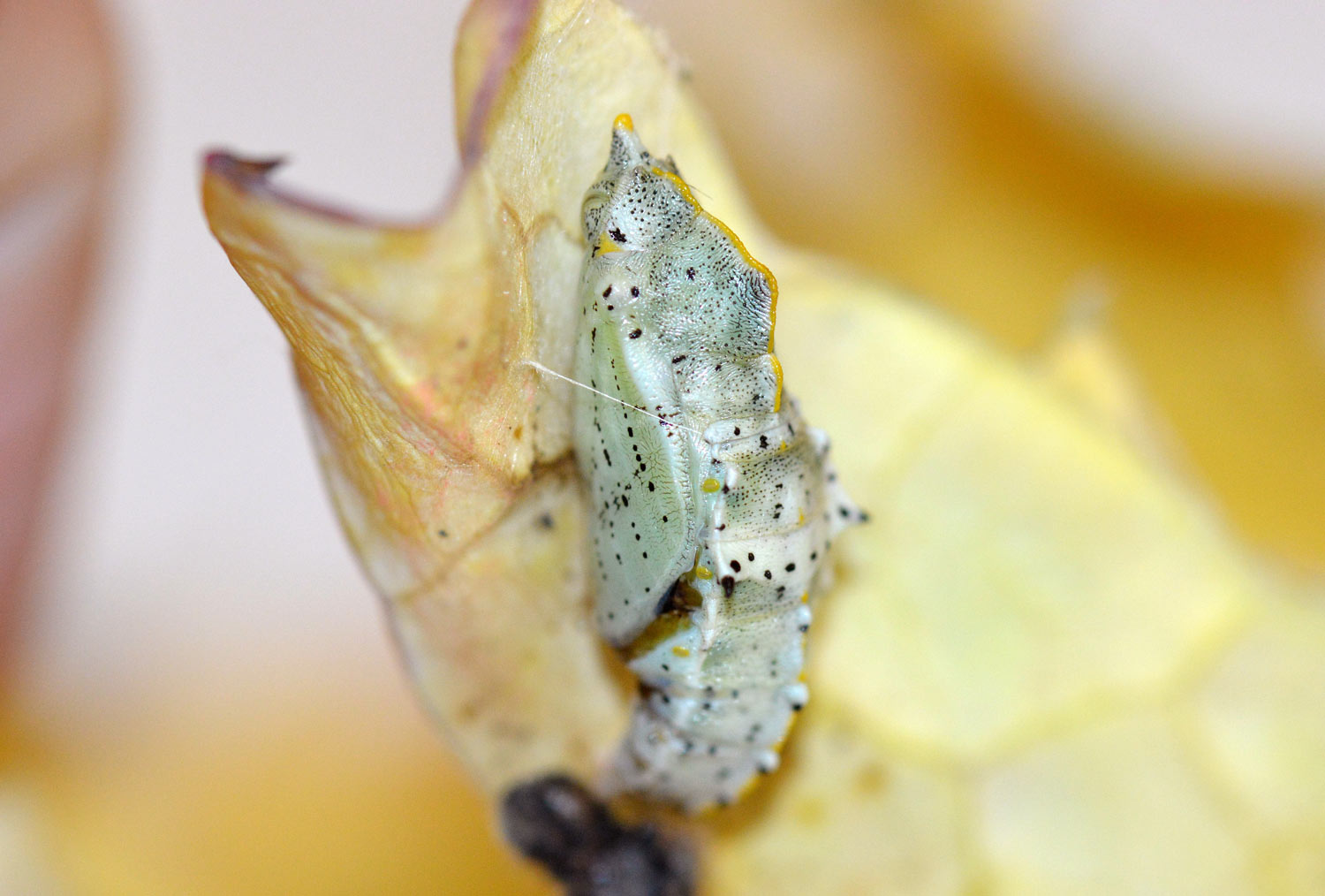 Fig 17. Crisálida de mariposa blanca de la col (Pieris brassicae)./ C. Pradera 06-2018